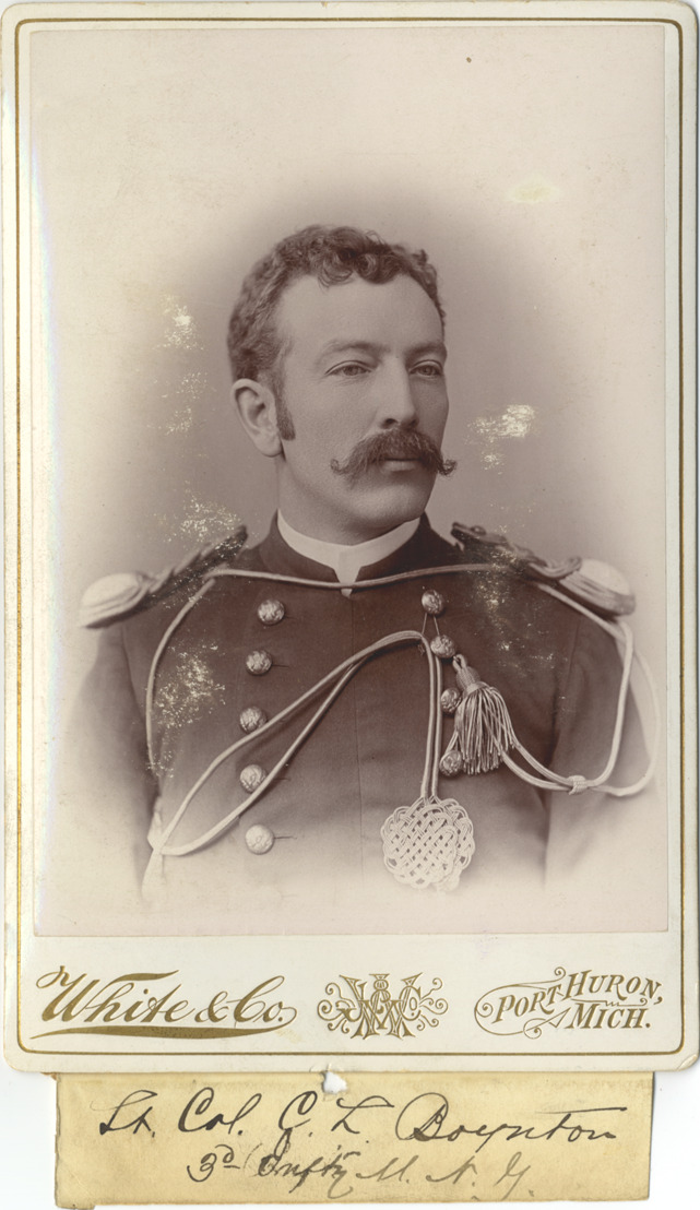 Cabinet card photograph of Lt. Col. C.L. Boynton in uniform, from the Detroit Light Infantry Veterans Corps photo album. The Corps is an offshoot of the Detroit Light Guard. Handwritten on a piece of paper pasted along the bottom of the front: "Lt. Col. C. L. Boynton, 3d Infty M.N.G." Embossed on mat front: "White & Co., Port Huron, Mich." Printed on back: drawing of the J.M. White & Co. building front and "J.M. White & Co. photographers, 1102 Military Street, Port Huron, Mich."