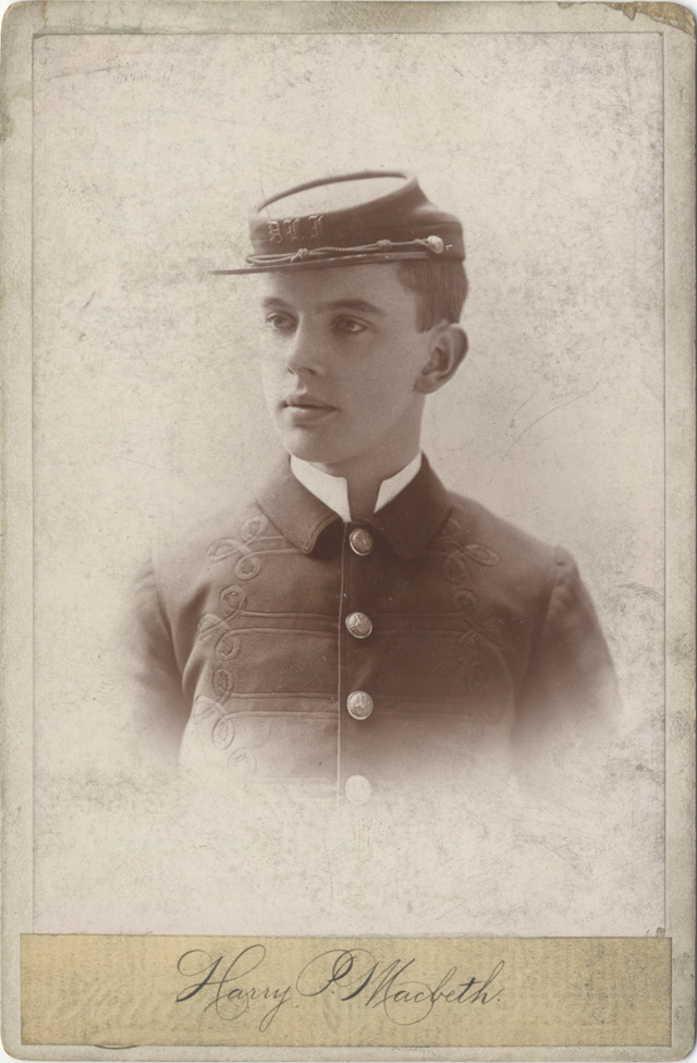 Cabinet card photograph of Harry P. Macbeth in uniform, from the Detroit Light Infantry Veterans Corps photo album. The Corps is an offshoot of the Detroit Light Guard. "Harry P. Macbeth" handwritten on paper pasted on card front and on back. Printed on back: "Hughes, 274 Woodward Ave., cor. Grand Circus Park, Detroit, Mich. Duplicates furnished at any time."
