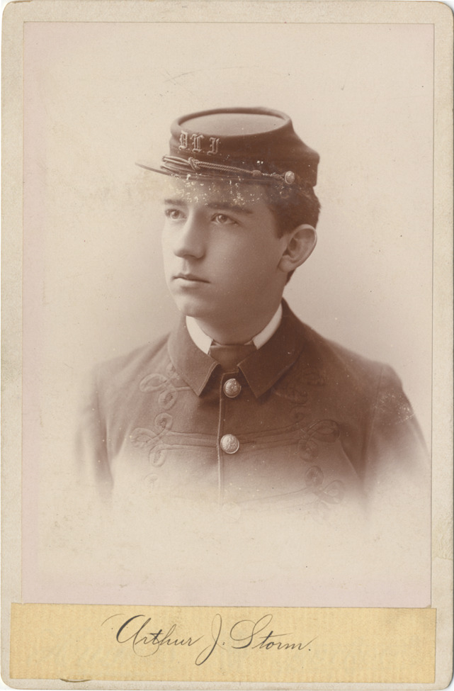 Cabinet card photograph of Arthur J. Storm in uniform, from the Detroit Light Infantry Veterans Corps photo album. The Corps is an offshoot of the Detroit Light Guard. "Arthur J. Storm" handwritten on paper pasted on card front and on back. Printed on back: "Hughes, 274 Woodward Ave., cor. Grand Circus Park, Detroit, Mich. Duplicates furnished at any time."