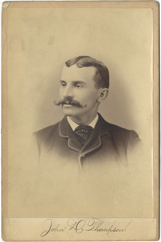 Cabinet card photograph of John D. Thompson, from the Detroit Light Infantry Veterans Corps photo album. The Corps is an offshoot of the Detroit Light Guard. "John D. Thompson" handwritten on paper pasted on card front and on back. Printed on back: "Thomson, successor to Williams & Thomson, Kansas City, Mo., All negatives preserved for 8 years."