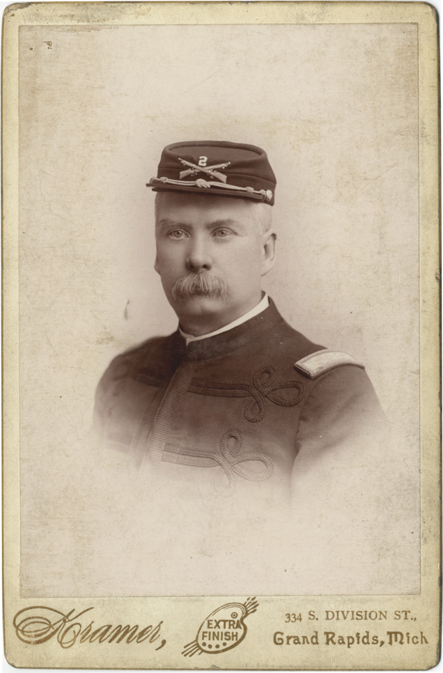 Cabinet card photograph of Charles A. Rane in uniform, from the Detroit Light Infantry Veterans Corps photo album. The Corps is an offshoot of the Detroit Light Guard. Embossed on front: "Kramer, extra finish, 334 S. Division St., Grand Rapids, Mich." Handwritten on back: "Chas. A. Rane, Colonel 2nd Infantry, M.N.G."