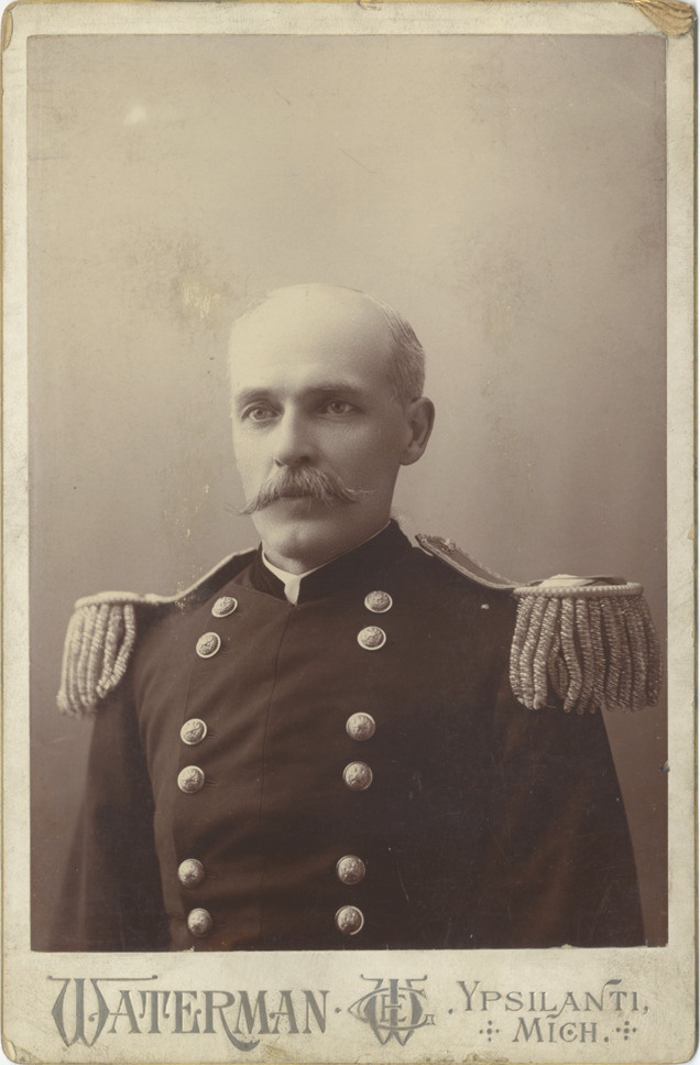 Cabinet card photograph of E.W. Bowen in uniform, from the Detroit Light Infantry Veterans Corps photo album. The Corps is an offshoot of the Detroit Light Guard. Embossed on card front: "Waterman, Ypsilanti, Mich." Handwritten on back: "Yours sincerely, E.W. Bowen, Brig. Gen. M.S.G."
