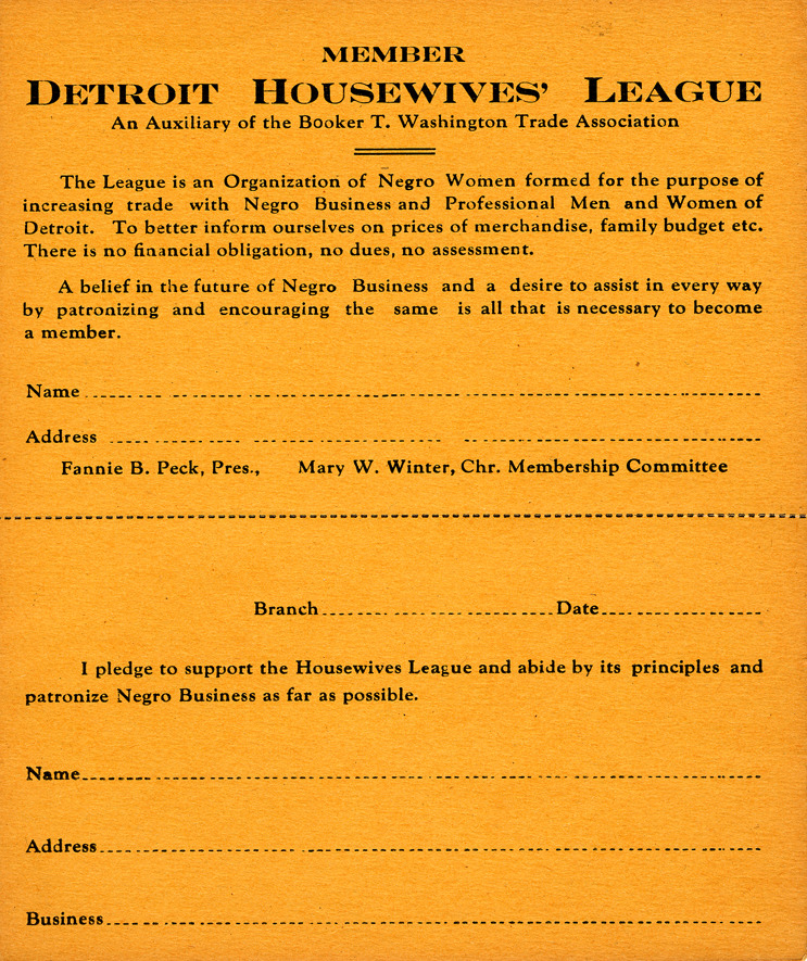 Favorite this☆ Housewives League of Detroit membership application Description: Membership application for the Housewives League of Detroit. Card outlines the goals of the Housewives League of Detroit. Details Resource ID: bh005124 Subject: Housewives League of Detroit--Membership African American women--Societies and clubs Membership cards Date Issued: 1930 (year approximate) Format: 1 membership card : col. ; 6 x 5 in. Member of: Burton Historical Collection Filing Location: MS/Housewives League of Detroit, 2:1 Rights: Physical rights are retained by DPL. Copyright is retained in accordance with U.S. copyright laws.