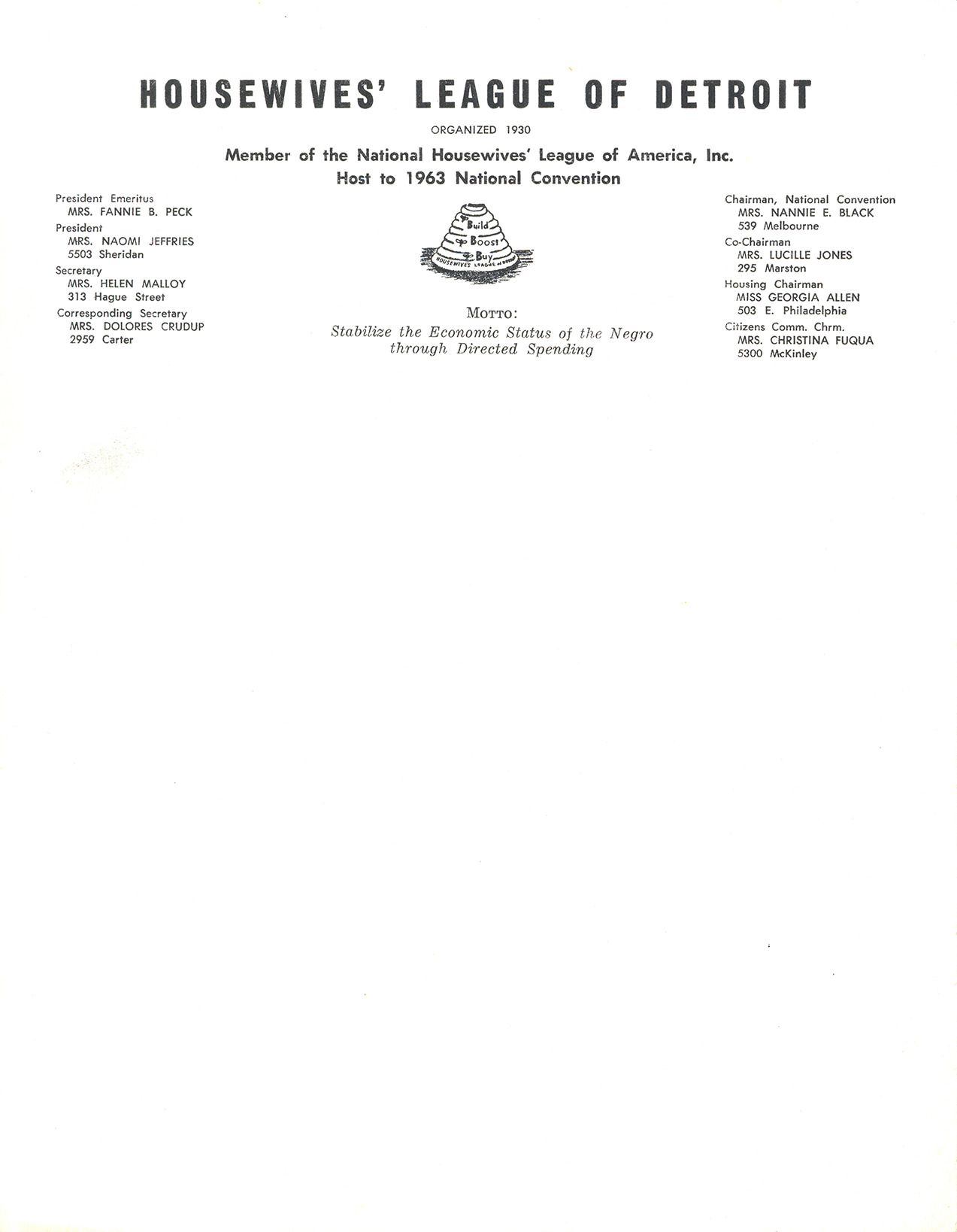 Housewives League of Detroit stationery. Printed on front: "Housewives' League of Detroit organized 1930, member of the National Housewives' League of America, Inc. Host to 1963 National Convention. Stabilize the economic status of the Negro through directed spending." Includes list of the organization's executive officers.