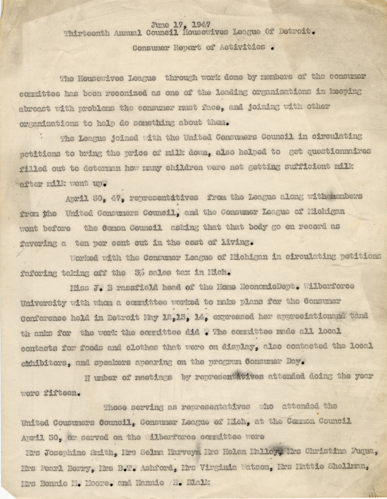Report of the Thirteenth Annual Council, Housewives League of Detroit, consumer report of activities. Printed on front: "June 17, 1947, Thirteenth Annual Council, Housewives League of Detroit, Consumer Report of Activities." The report documents work done by the Housewives League's Consumer Committee in conjunction with the United Consumers Council. Requests that the Detroit Common Council go on record favoring a ten per cent cut in the cost of living; circulating petitions to remove the 3% sales tax in Michigan; working with Wilberforce University on a Consumer Conference in Detroit; and contacting exhibitors for the Consumer Conference held in Detroit, May 12-14, 1947.