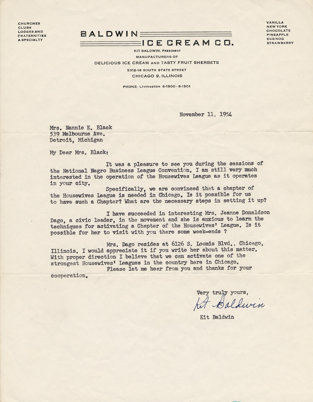 Letter from Kit Baldwin of the Baldwin Ice Cream Co. of Chicago, Illinois to Nannie E. Black of the Housewives League of Detroit, requesting information on starting a chapter of the Housewives League in Chicago.