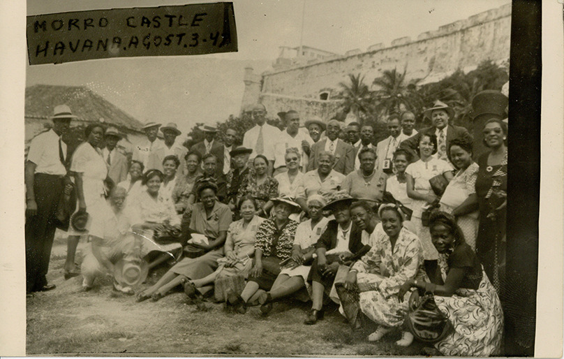 Group portrait of thirty-nine members of the Housewives League of Detroit and the Booker T. Washington Trade Association, at Morro Castle, in Havana, Cuba, August 3, 1947. Mrs. Fannie Peck is seated in the second row, fifth from the left. Printed on front: "Morro Castle. Havana, Agost. 3-47."