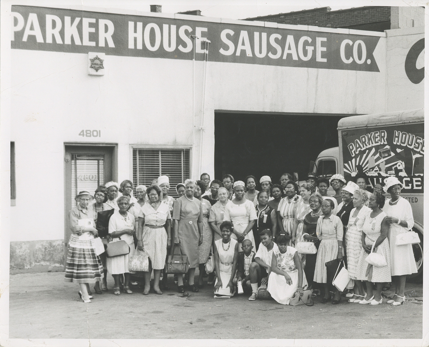 Group portrait of members of the Housewives League of Detroit at the 1963 National Convention of the National Housewives League. Parker House Sausage Co. building and delivery truck in background. Embossed on front: "Sonny Edwards, exclusive." Stamped on back: "Edwards, photo. 863-5711." Handwritten on back: "1963, Detroit Housewives League, National Convention, 1963. Host to National."