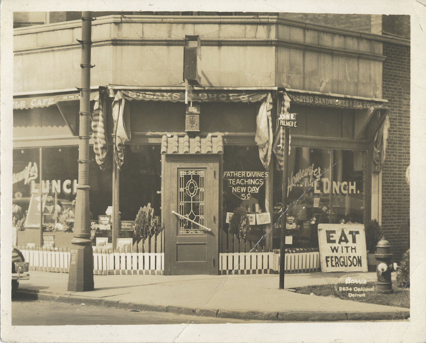 View of Ferguson's Restaurant at the corner of John R and East Palmer St. Signs in window read: "Father Devine's teachings new day 5 [cents]," "Housewife's Lunch." Sign leaning on exterior of the building reads "Eat with Ferguson." Printed on front: "Harris, 8534 Oakland, Detroit."