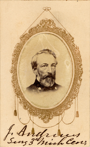 Favorite this☆ Portrait of Josiah Andrews Description: Portrait photograph of Josiah Andrews in uniform, from the Civil War 3rd Michigan Cavalry picture album. Handwritten on front: "J. Andrews, Surg. 3rd Mich. Cav." Details Resource ID: bh005176 Subject: United States. Army. Michigan Cavalry Regiment, 3rd (1861-1866) Michigan--Militia United States--History--Civil War, 1861-1865 Soldiers--Michigan Physicians--Michigan Military uniforms Portrait photography Carte de visite photographs Photographic prints Date Issued: 1861 to 1864 Format: 1 carte de visite ; image 2 x 1.5 in. Member of: Burton Historical Collection Filing Location: M/Militia-Third Michigan Cavalry Rights: Physical rights are retained by DPL. Copyright is retained in accordance with U.S. copyright laws.