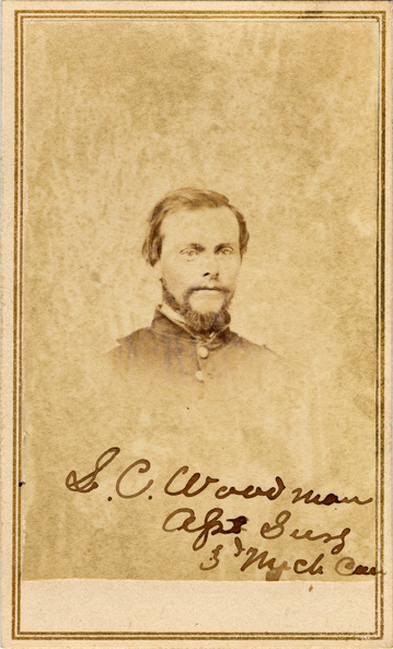 Portrait of Assistant Surgeon S.C. Woodman in uniform, from the Civil War 3rd Michigan Cavalry picture album. Handwritten on front: "S.C. Woodman, Asst. Surg. 3rd Mich. Cav." Handwritten on back: "Promoted to surgeon of M. 11th Cav. Left for Corinth Sept. 25th, 1863."