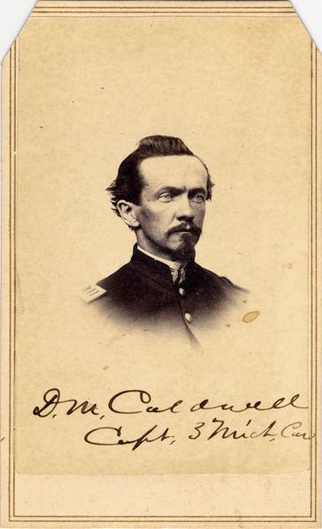 Favorite this☆ Daniel M. Caldwell Description: Portrait of Daniel M. Caldwell in uniform, 3rd Regiment, Company L, from the Civil War 3rd Michigan Cavalry picture album. Handwritten on front: "D.M. Caldwell, Capt. 3 Mich. Cav." Printed on back: "Detroit, J.J. Bardwell, photographer, Michigan." Details Resource ID: bh005187 Creator: Bardwell, Jex, 1824-1902 Subject: United States. Army. Michigan Cavalry Regiment, 3rd (1861-1866) Michigan--Militia United States--History--Civil War, 1861-1865 Soldiers--Michigan Military uniforms Photographers--Michigan--Detroit Portrait photography Carte de visite photographs Photographic prints Date Issued: 1861 to 1864 Format: 1 carte de visite ; image 3.5 x 2.25 in. Member of: Burton Historical Collection Filing Location: M/Militia-Third Michigan Cavalry Rights: Physical rights are retained by DPL. Copyright is retained in accordance with U.S. copyright laws.