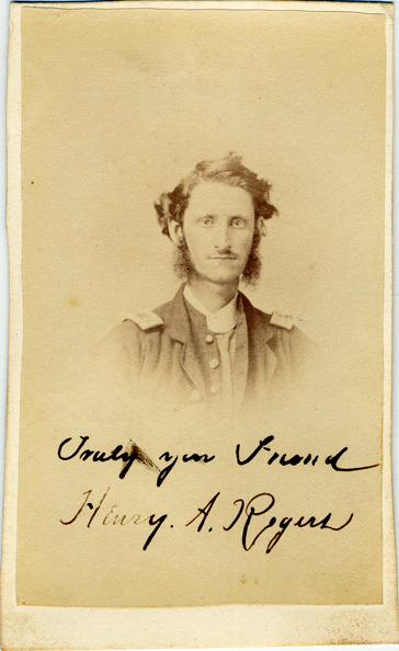 Favorite this☆ Henry A. Rogers Description: Portrait of First Lieutenant Henry A. Rogers in uniform, 3rd Regiment, Company H,from the Civil War 3rd Michigan Cavalry picture album. Handwritten on front: "Truly your friend, Henry A. Rogers." Details Resource ID: bh005206 Subject: United States. Army. Michigan Cavalry Regiment, 3rd (1861-1866) Michigan--Militia United States--History--Civil War, 1861-1865 Soldiers--Michigan Military uniforms Portrait photography Carte de visite photographs Photographic prints Date Issued: 1861 to 1864 Format: 1 carte de visite ; 3.5 x 2.25 in. Member of: Burton Historical Collection Filing Location: M/Militia-Third Michigan Cavalry Rights: Physical rights are retained by DPL. Copyright is retained in accordance with U.S. copyright laws.