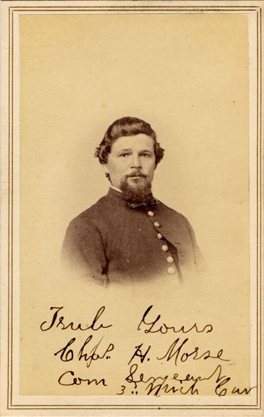 Portrait photograph of Charles H. Morse in uniform, from the Civil War 3rd Michigan Cavalry picture album. Handwritten on front: "Truly Yours, Chas. H. Morse, Com. Sergeant, 3rd Mich. Cav."