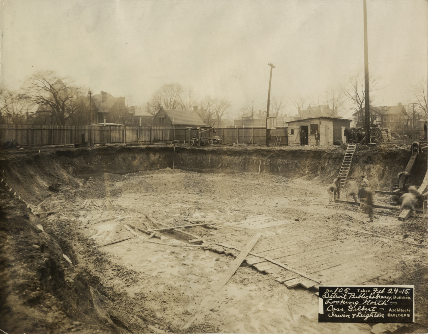 View of excavation for foundation of Main Library, Detroit Public Library. Men lift boards inside foundation; shed in background. Printed on front: "No. 105. Taken Feb 24-15. Detroit Public Library building. Looking north. Cass Gilbert, architect. Irwin & Leighton, builders." Stamped on back: "Charles Ruel Messinger, commercial photographer, 1646 Woodward Ave., Detroit, Mich., phone Hemlock 2186, phone North 6298."