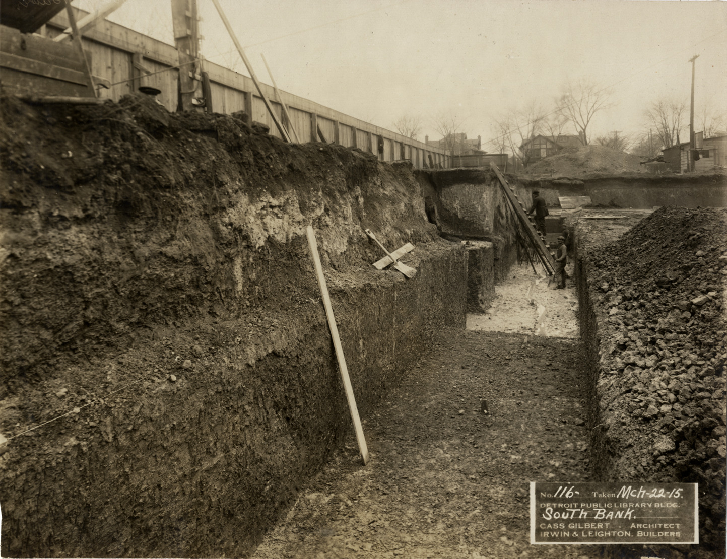 View of excavation for foundation of Main Library, Detroit Public Library. Wooden fence borders south bank of foundation; two construction workers stand in trench. Printed on front: "No. 116. Taken Mch-22-15. Detroit Public Library bldg. South bank. Cass Gilbert, architect. Irwin & Leighton, builders." Stamped on back: "Charles Ruel Messinger, commercial photographer, 1646 Woodward Ave., Detroit, Mich., phone Hemlock 2186, phone North 6298."