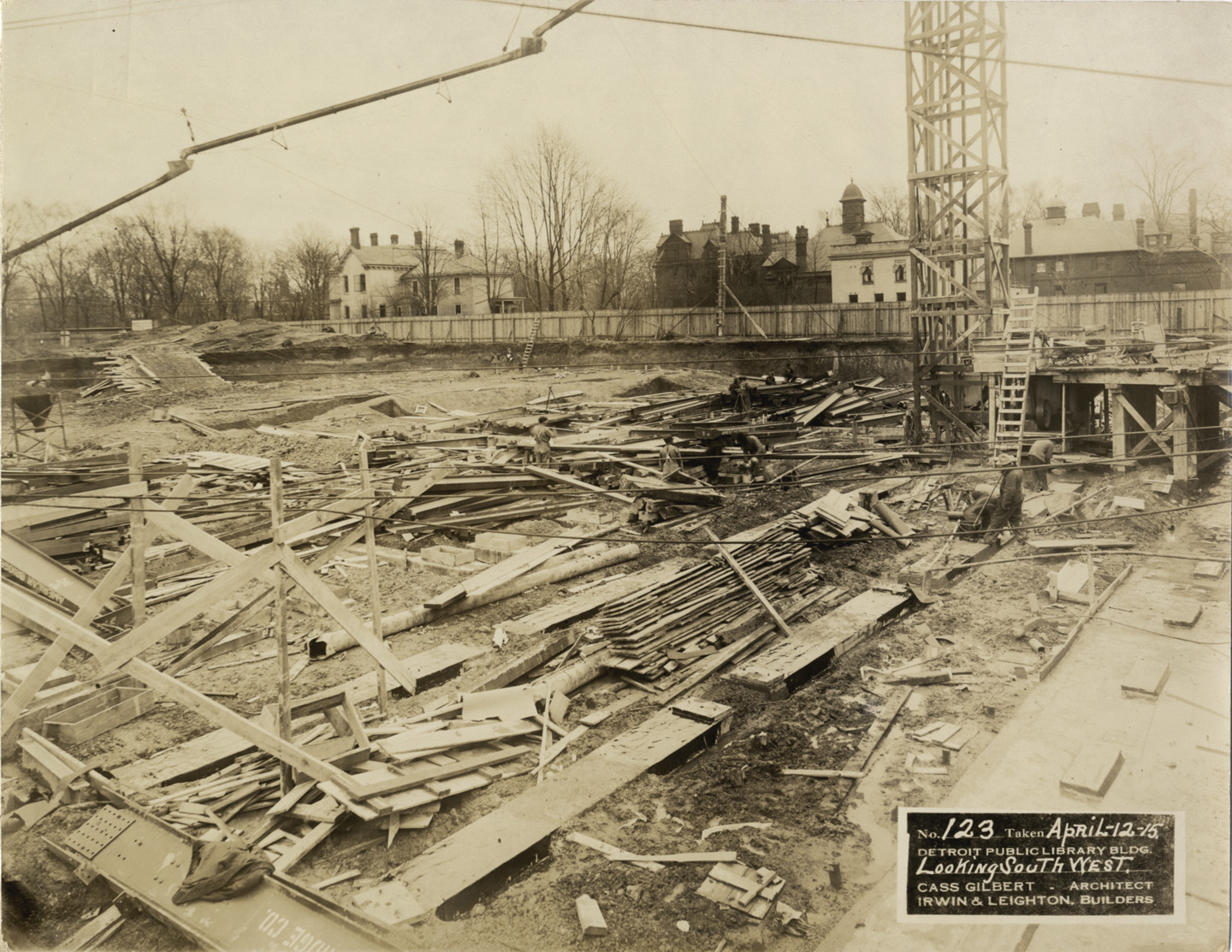 View of numerous boards and beams on construction site for foundation of Main Library, Detroit Public Library. Tower, sluice and houses in background. Printed on front: "No. 123. Taken April 12-15. Detroit Public Library bldg. Looking southwest. Cass Gilbert, architect. Irwin & Leighton, builders." Stamped on back: "Charles Ruel Messinger, commercial photographer, 1646 Woodward Ave., Detroit, Mich., phone Hemlock 2186, phone North 6298."