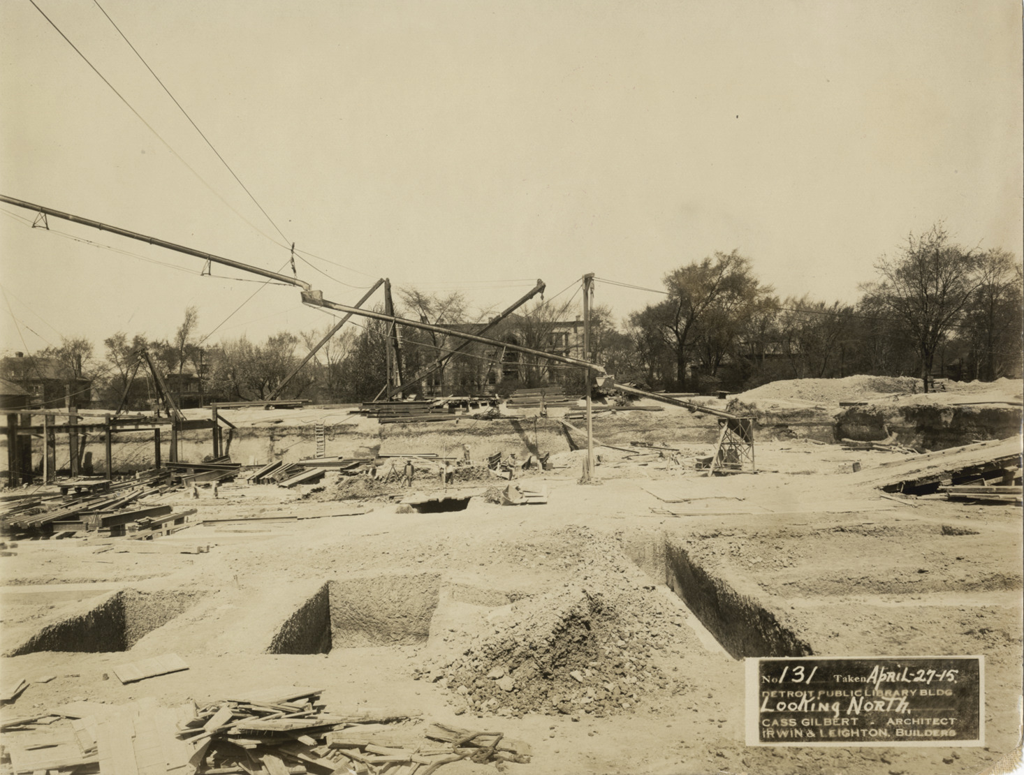 View of excavation for foundation of Main Library, Detroit Public Library. Several trenches in foreground; sluice stretches across construction site. Printed on front: "No. 131. Taken April 27-15. Detroit Public Library bldg. Looking north. Cass Gilbert, architect. Irwin & Leighton, builders." Stamped on back: "Charles Ruel Messinger, commercial photographer, 1646 Woodward Ave., Detroit, Mich., phone Hemlock 2186, phone North 6298."