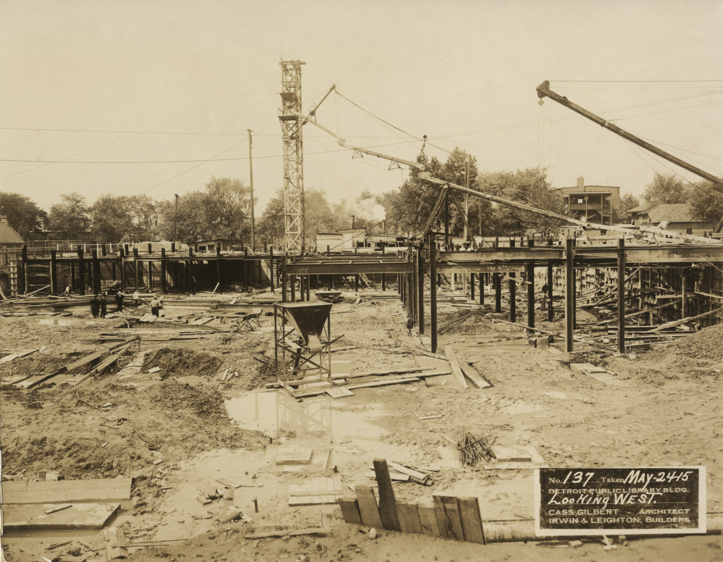 View of framework of Main Library, Detroit Public Library during construction. Tower and sluice in background; debris in foreground. Printed on front: "No. 137. Taken May 24-15. Detroit Public Library bldg. Looking west. Cass Gilbert, architect. Irwin & Leighton, builders." Stamped on back: "Charles Ruel Messinger, commercial photographer, 1646 Woodward Ave., Detroit, Mich., phone North 6298."