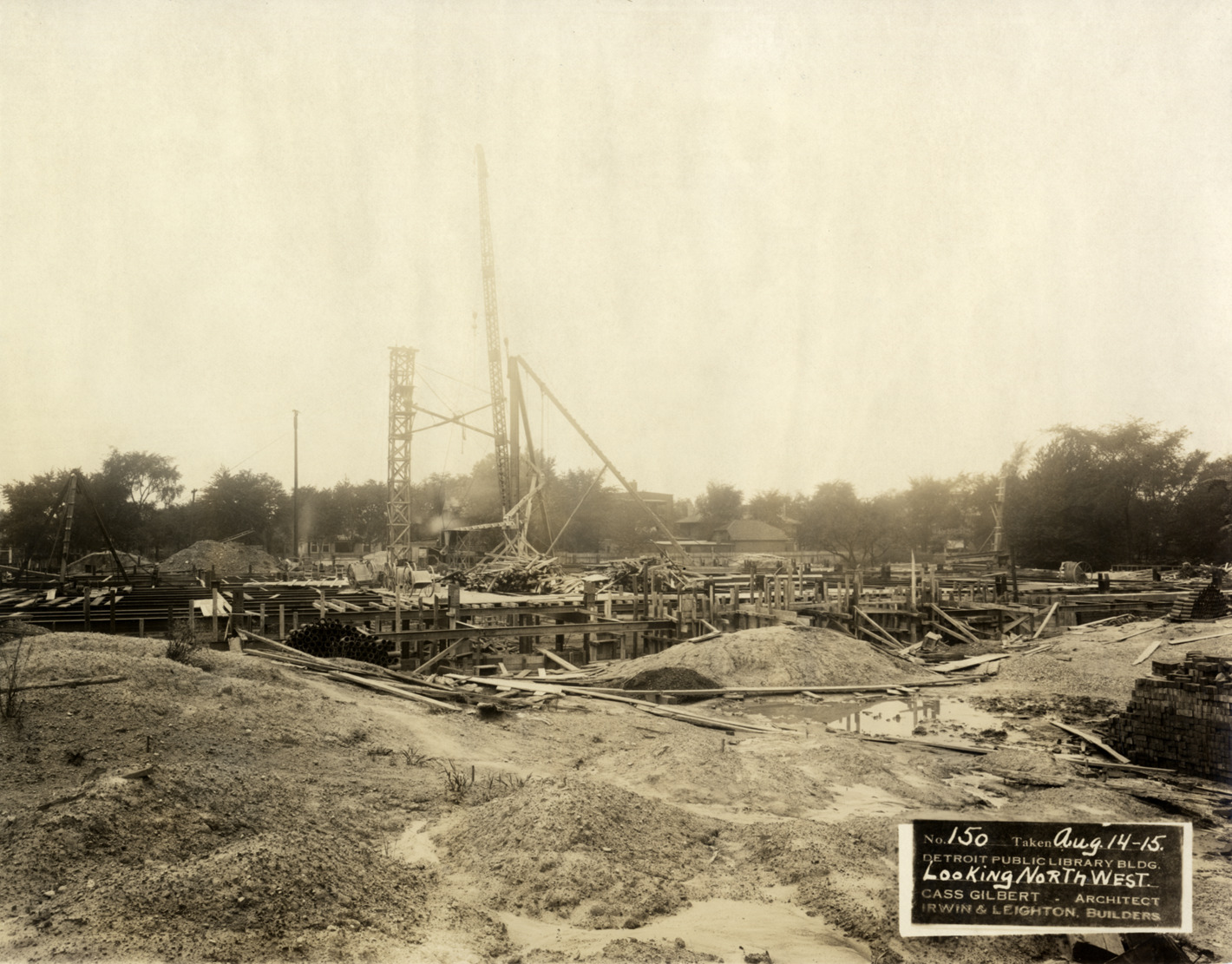 View of framework of Main Library, Detroit Public Library during construction. Crane on construction site. Printed on front: "No. 150. Taken Aug. 14-15. Detroit Public Library bldg. Looking northwest. Cass Gilbert, architect. Irwin & Leighton, builders." Stamped on back: "Charles Ruel Messinger, commercial photographer, 1646 Woodward Ave., Detroit, Mich., Market 6298."