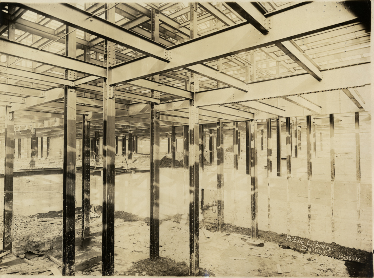 View from inside of framework of Main Library, Detroit Public Library during construction, showing site of basement and sub basement. Printed on front: "Public Library, Detroit. 1-10-16." Stamped on back: "Babcock and Dolbey, 92-94 Griswold St., Detroit, Mich., Cadillac 3189." Handwritten on back: "Basement and sub basement."