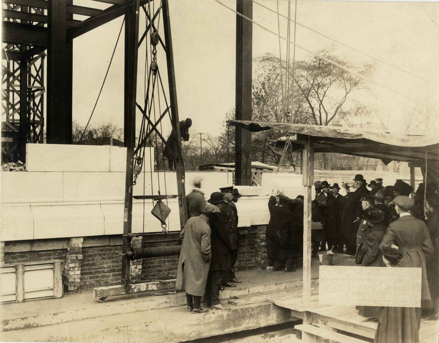 View of cornerstone laying for Main Library, Detroit Public Library. Crowd and photographer watch ceremony. Printed on front: "Taken Nov-1-17. Detroit Public Library bldg. Laying cornerstone. Cass Gilbert, architects. Geo. A. Fuller Co., builders. Chas. R. Messinger, photographer." Stamped on back: "Charles R. Messinger, commercial photographer, 1646 Woodward Ave., Detroit, Mich., Market 6298."