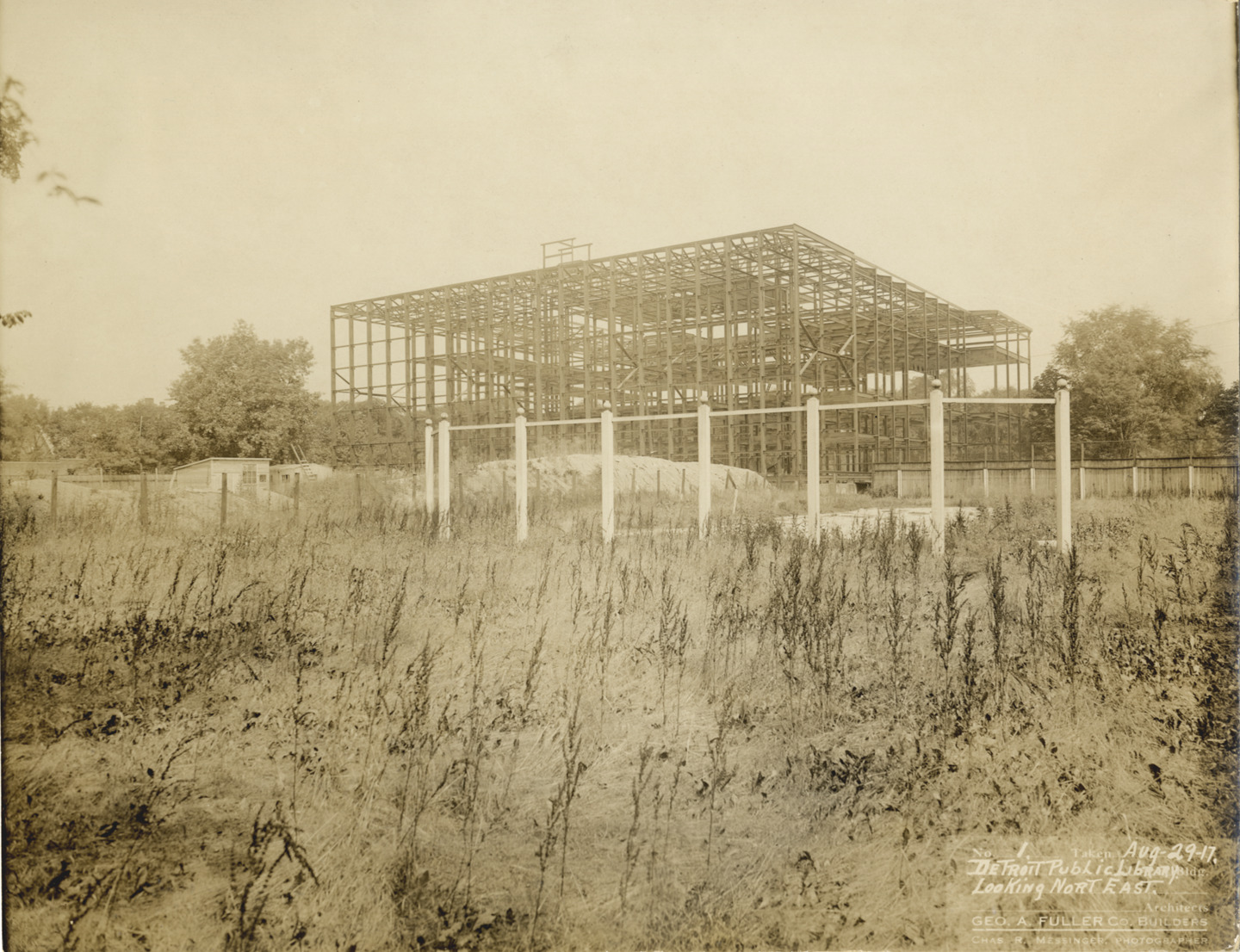 View of framework of Main Library, Detroit Public Library during construction. Fence posts and overgrown field in foreground. Printed on front: "No. 1. Taken Aug-29-17. Detroit Public Library bldg. Looking nort [sic] east. [blank] architects. Geo. A. Fuller Co., builders. Chas. R. Messinger, photographer." Stamped on back: "Charles R. Messinger, commercial photographer, 1646 Woodward Ave., Detroit, Mich., Market 6298."