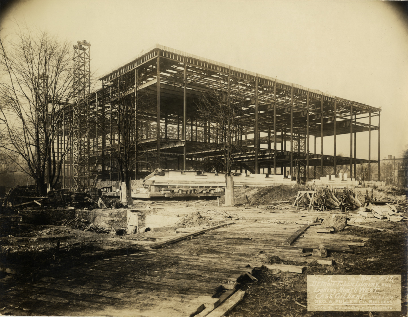 View of framework of Main Library, Detroit Public Library during construction. Scaffolding adjacent to building; plank walkway or driveway in foreground. Printed on front: "No. 7. Taken Nov-5-17. Detroit Public Library bldg. Looking northwest. Cass Gilbert, architects. Geo. A. Fuller Co., builders. Chas. R. Messinger, photographer." Stamped on back: "Charles R. Messinger, commercial photographer, 1646 Woodward Ave., Detroit, Mich., Market 6298."
