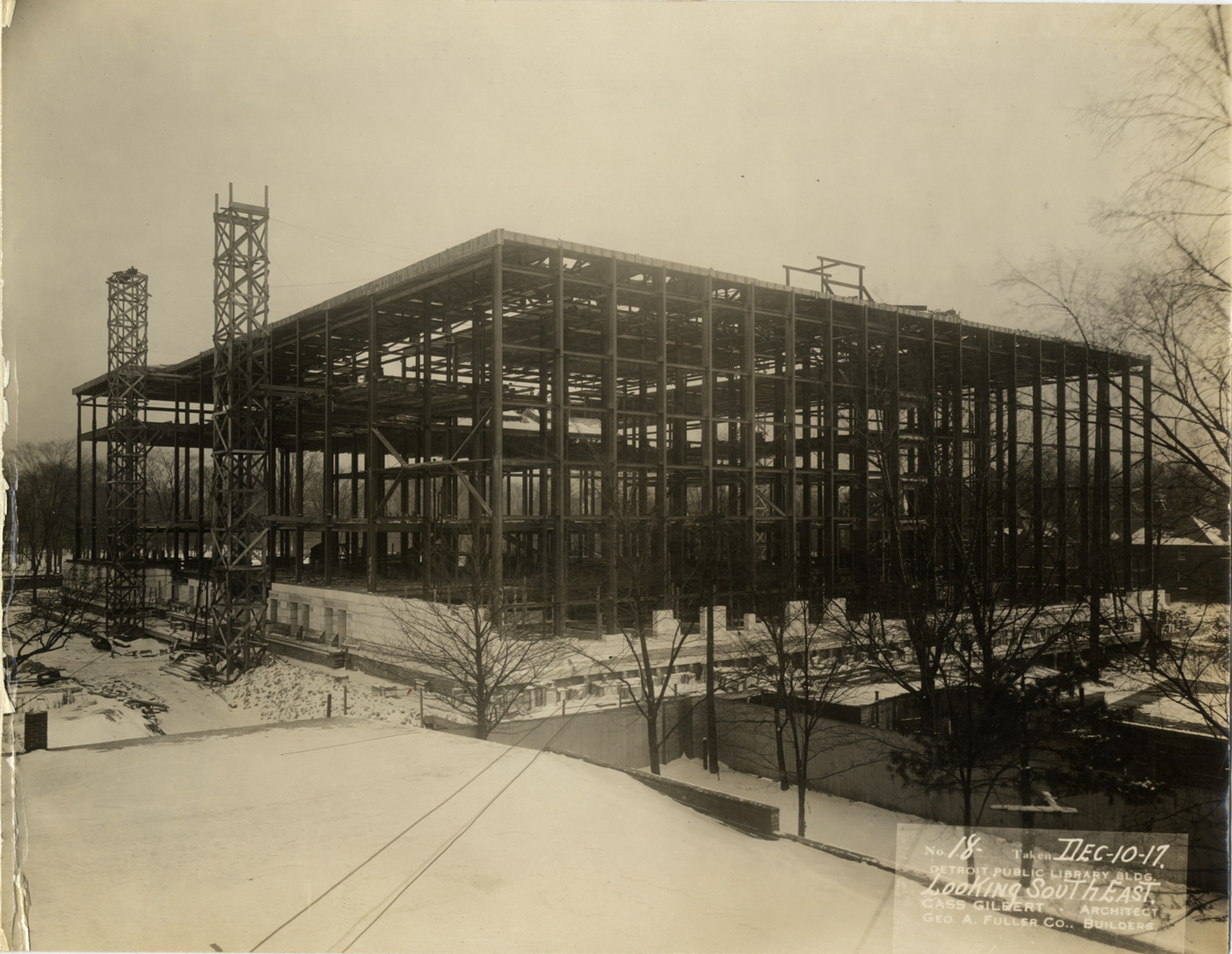 View of framework of Main Library, Detroit Public Library during construction. Scaffolding adjacent to building. Printed on front: "No. 18. Taken Dec-10-17. Detroit Public Library bldg. Looking southeast. Cass Gilbert, architect. Geo. A. Fuller Co., builders." Stamped on back: "Charles R. Messinger, commercial photographer, 1646 Woodward Ave., Detroit, Mich., Market 6298."