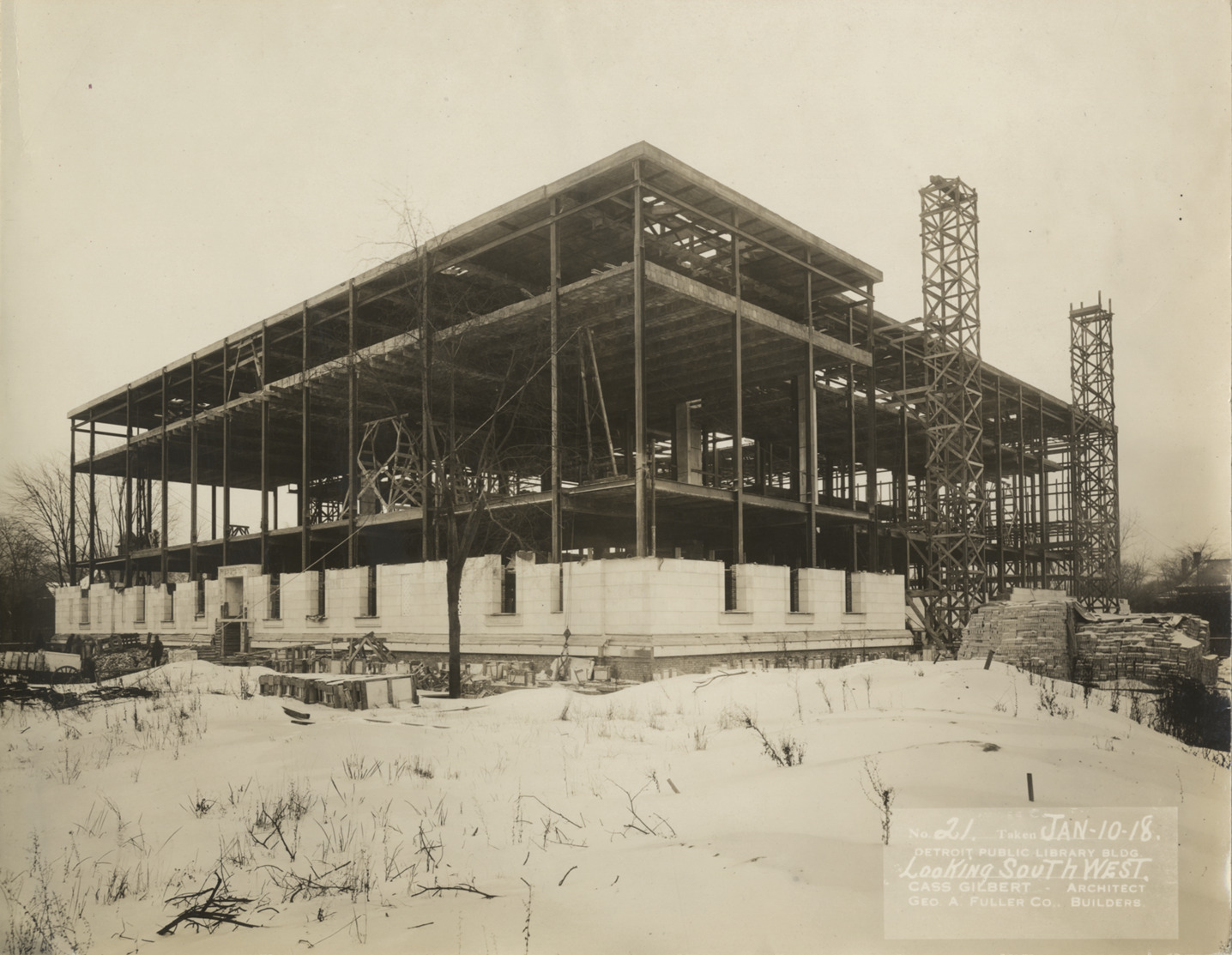 Southwest view of Main Library, Detroit Public Library during construction. Structural frame of building. Piles of construction materials adjacent to scaffolding; snow in foreground. Printed on front: "No. 21. Taken Jan-10-18. Detroit Public Library bldg., looking southwest. Cass Gilbert, architect. Geo. A. Fuller Co., builders." Stamped on back: "Charles R. Messinger, commercial photographer, 1646 Woodward Ave., Detroit, Mich., Market 6298."