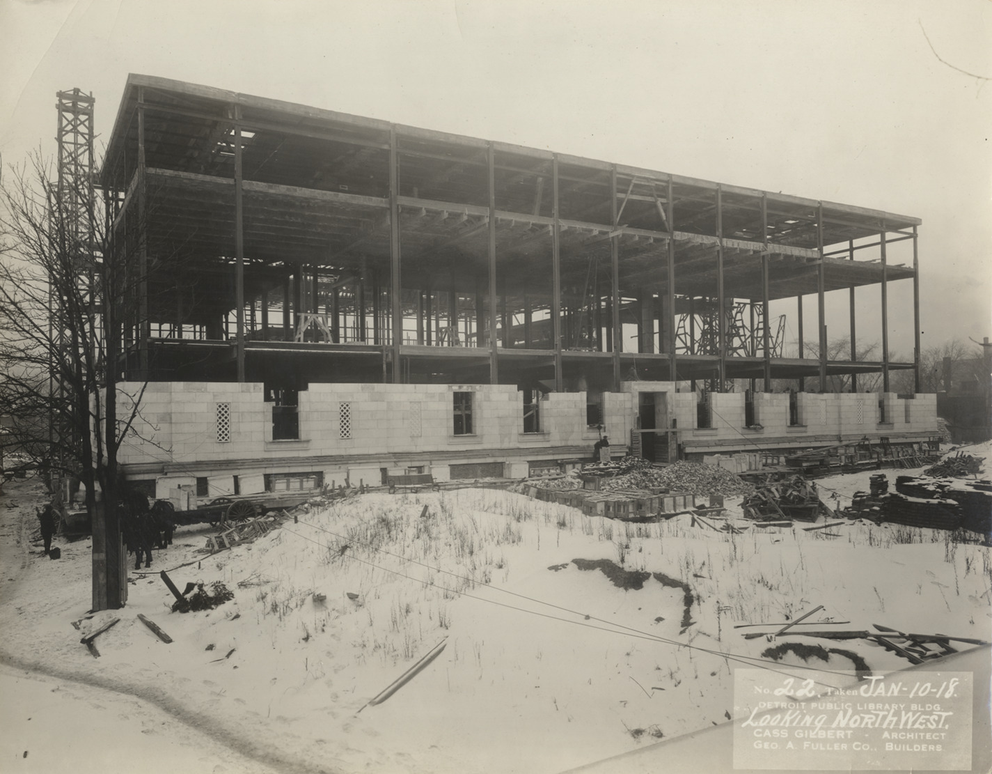 Northwest view of Main Library, Detroit Public Library during construction. Structural frame of building with partially completed facade. Snow-covered construction materials in foreground. Printed on front: "No. 22. Taken Jan-10-18. Detroit Public Library bldg., looking northwest. Cass Gilbert, architect. Geo. A. Fuller Co., builders." Stamped on back: "Charles R. Messinger, commercial photographer, 1646 Woodward Ave., Detroit, Mich., Market 6298."