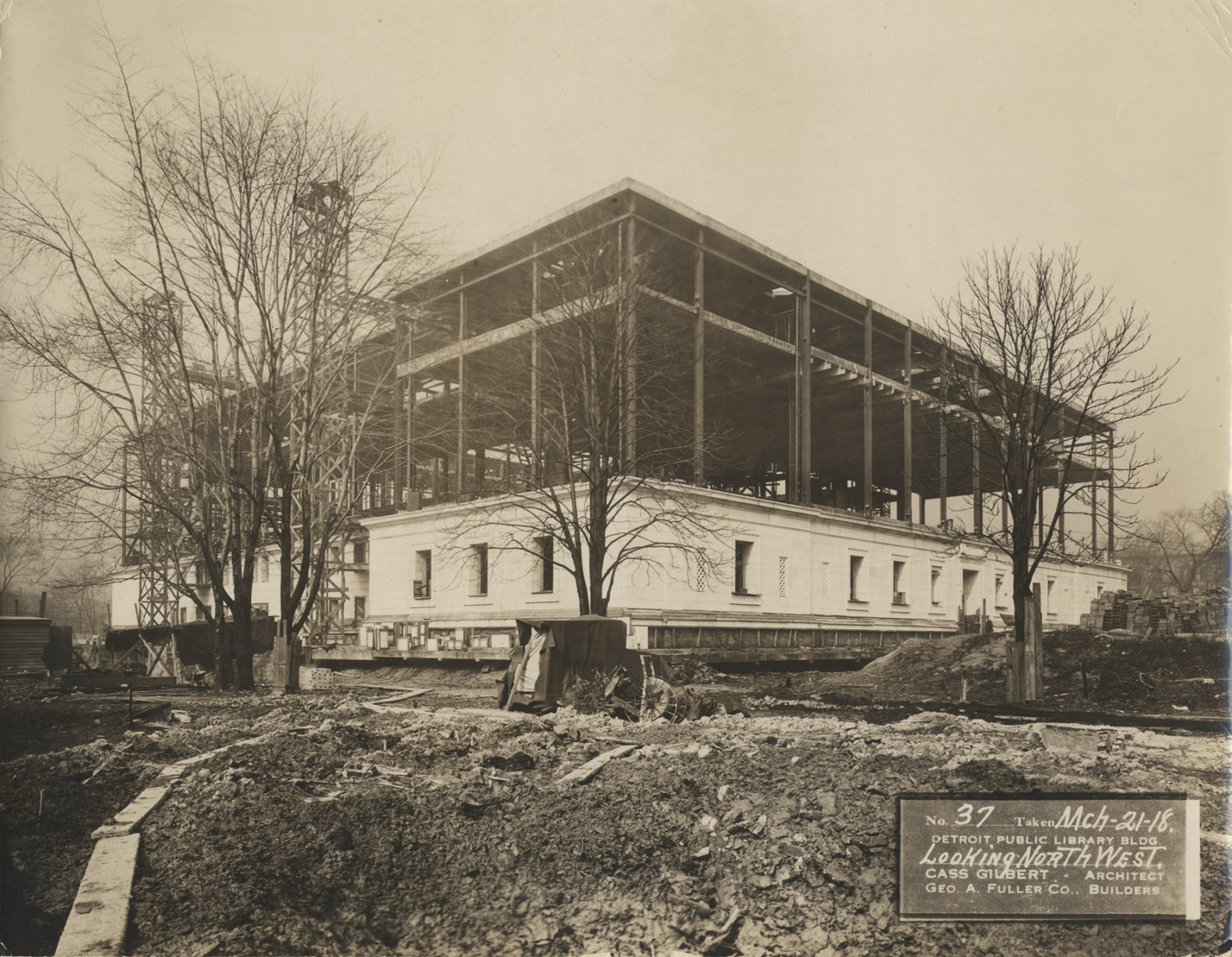View at an angle of Main Library, Detroit Public Library during construction, facing northwest. Structural frame of building with partially completed facade. Scaffolding on side of building; building partially obscured by trees. Printed on front: "No. 37. Taken Mch-21-18. Detroit Public Library bldg., looking northwest. Cass Gilbert, architect. Geo. A. Fuller Co., builders." Stamped on back: "Charles R. Messinger, commercial photographer, 1646 Woodward Ave., Detroit, Mich., Market 6298."