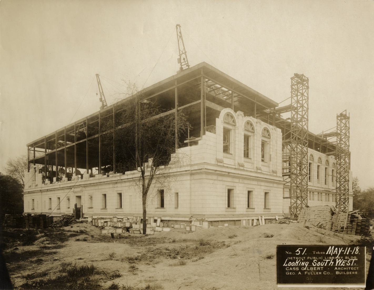 View at an angle of Main Library, Detroit Public Library during construction, facing southwest. Structural frame of building with partially completed facade. Scaffolding on side of building; two cranes on roof. Printed on front: "No. 51. Taken May-11-18. Detroit Public Library bldg., looking southwest. Cass Gilbert, architect. Geo. A. Fuller Co., builders." Stamped on back: "Charles R. Messinger, commercial photographer, 1646 Woodward Ave., Detroit, Mich., Market 6298."