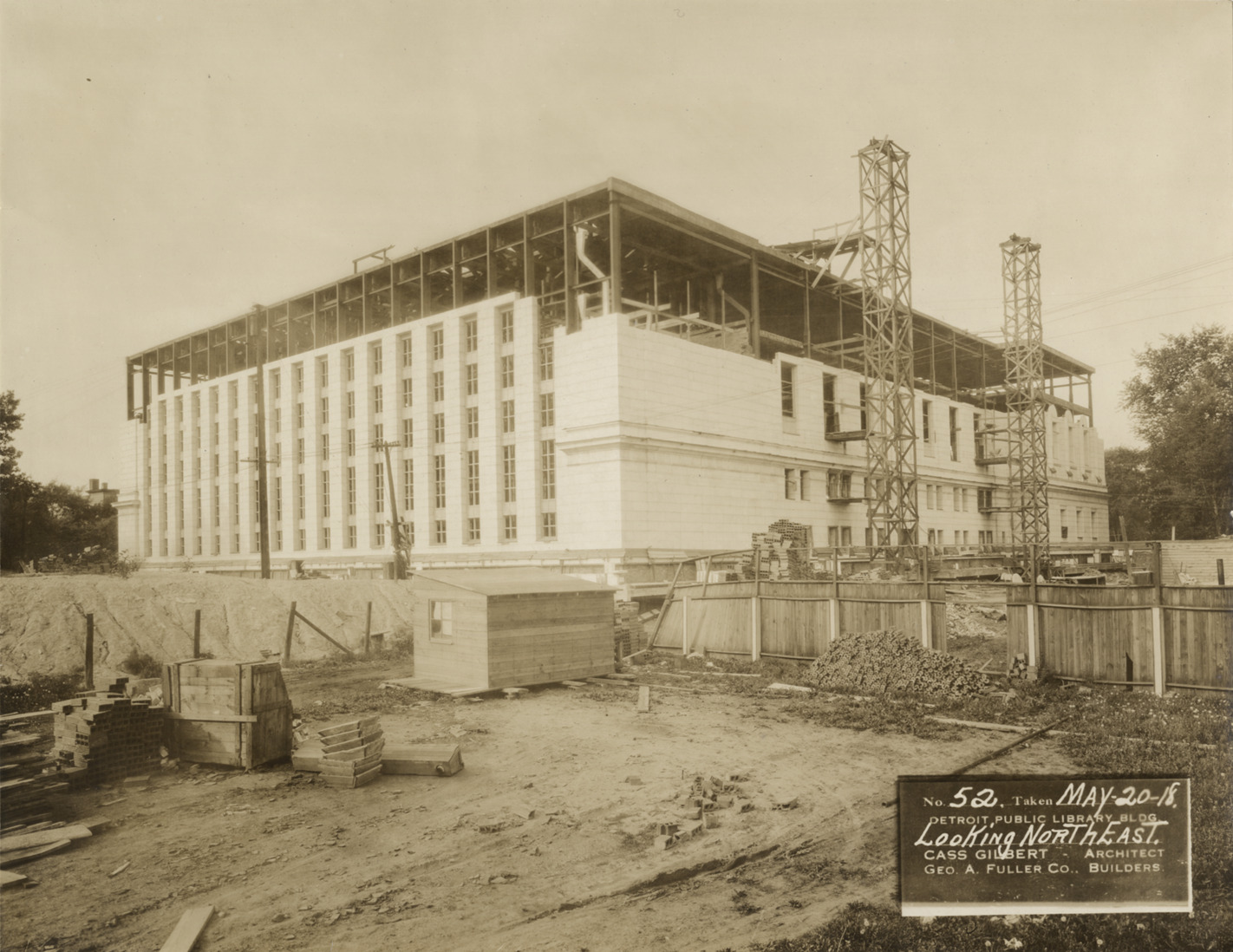 View at an angle of Main Library, Detroit Public Library during construction, facing northeast. Structural frame of building with nearly completed facade; scaffolding on side. Wooden shed, fence and construction materials in foreground. Printed on front: "No. 52. Taken May-20-18. Detroit Public Library bldg., looking northeast. Cass Gilbert, architect. Geo. A. Fuller Co., builders." Stamped on back: "Charles R. Messinger, commercial photographer, 1646 Woodward Ave., Detroit, Mich., Market 6298."