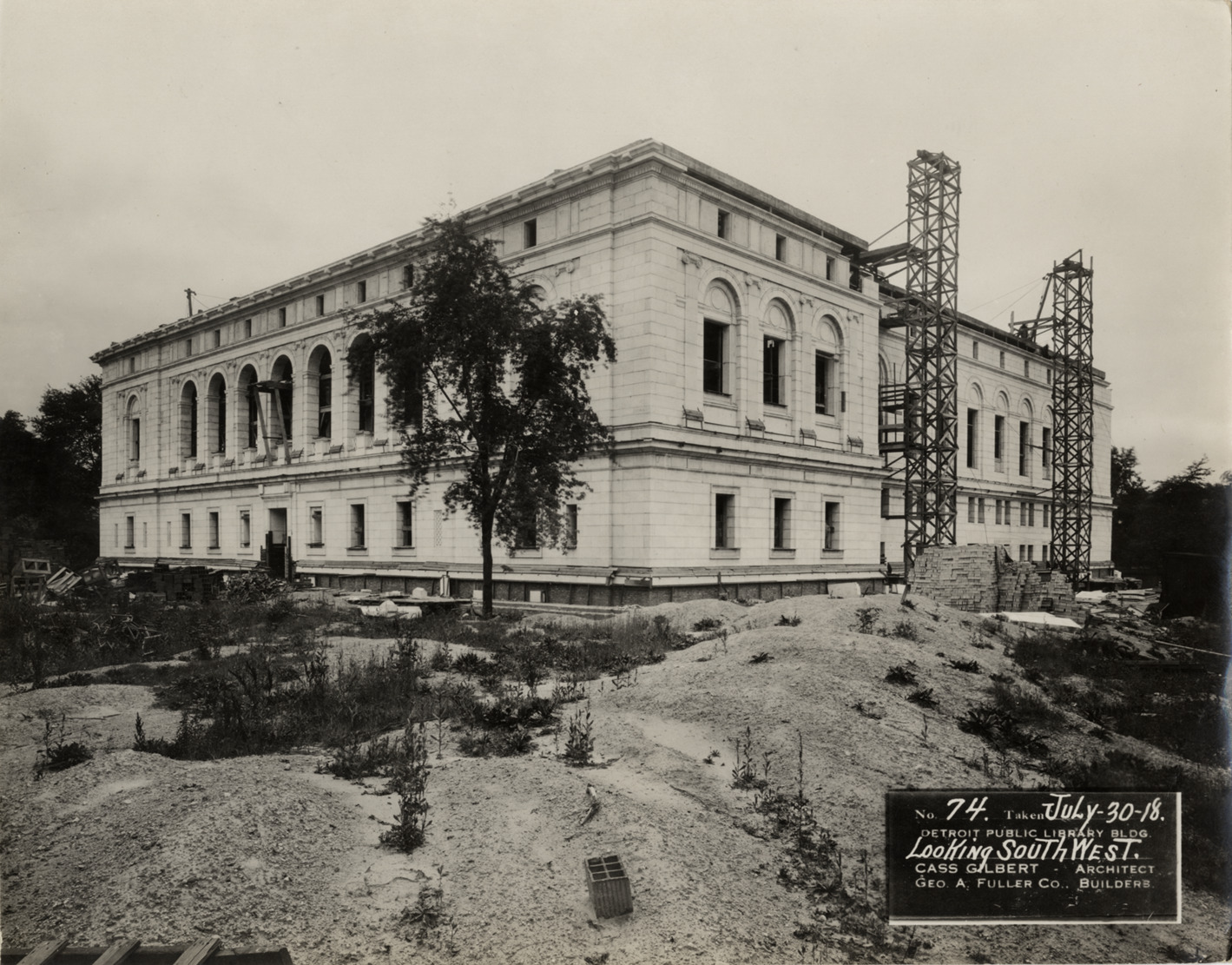 View at an angle of Main Library, Detroit Public Library during construction, facing southwest. Facade and roof cornice nearly complete; scaffolding on side. Printed on front: "No. 74. Taken July-30-18. Detroit Public Library bldg., looking southwest. Cass Gilbert, architect. Geo. A. Fuller Co., builders." Stamped on back: "Charles R. Messinger, commercial photographer, 1646 Woodward Ave., Detroit, Mich., Market 6298."