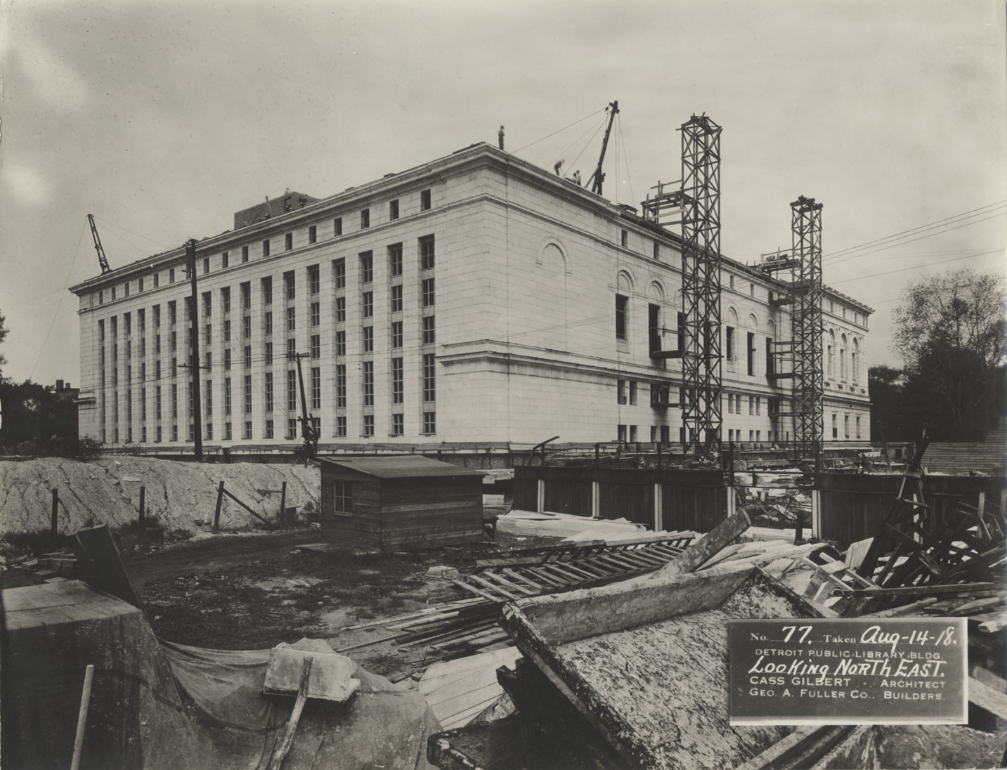 View at an angle of Main Library, Detroit Public Library during construction, facing northeast. Facade and roof cornice nearly complete; scaffolding on side. Men working on roof. Wooden shed, fence and construction materials in foreground. Printed on front: "No. 77. Taken Aug-14-18. Detroit Public Library bldg., looking northeast. Cass Gilbert, architect. Geo. A. Fuller Co., builders." Stamped on back: "Charles R. Messinger, commercial photographer, 1646 Woodward Ave., Detroit, Mich., Market 6298."