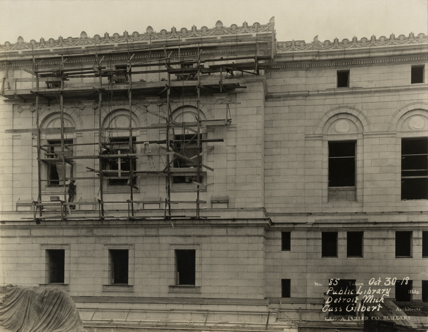 View of facade of Main Library, Detroit Public Library during construction. Man stands on scaffolding in front of windows. Printed on front: "No. 85. Taken Oct 30-18. Public Library bldg., Detroit, Mich. Cass Gilbert, architect. Geo. A. Fuller Co., builders." Stamped on back: "Spencer & Wyckoff, commercial photographers, Smith Bldg., Detroit."