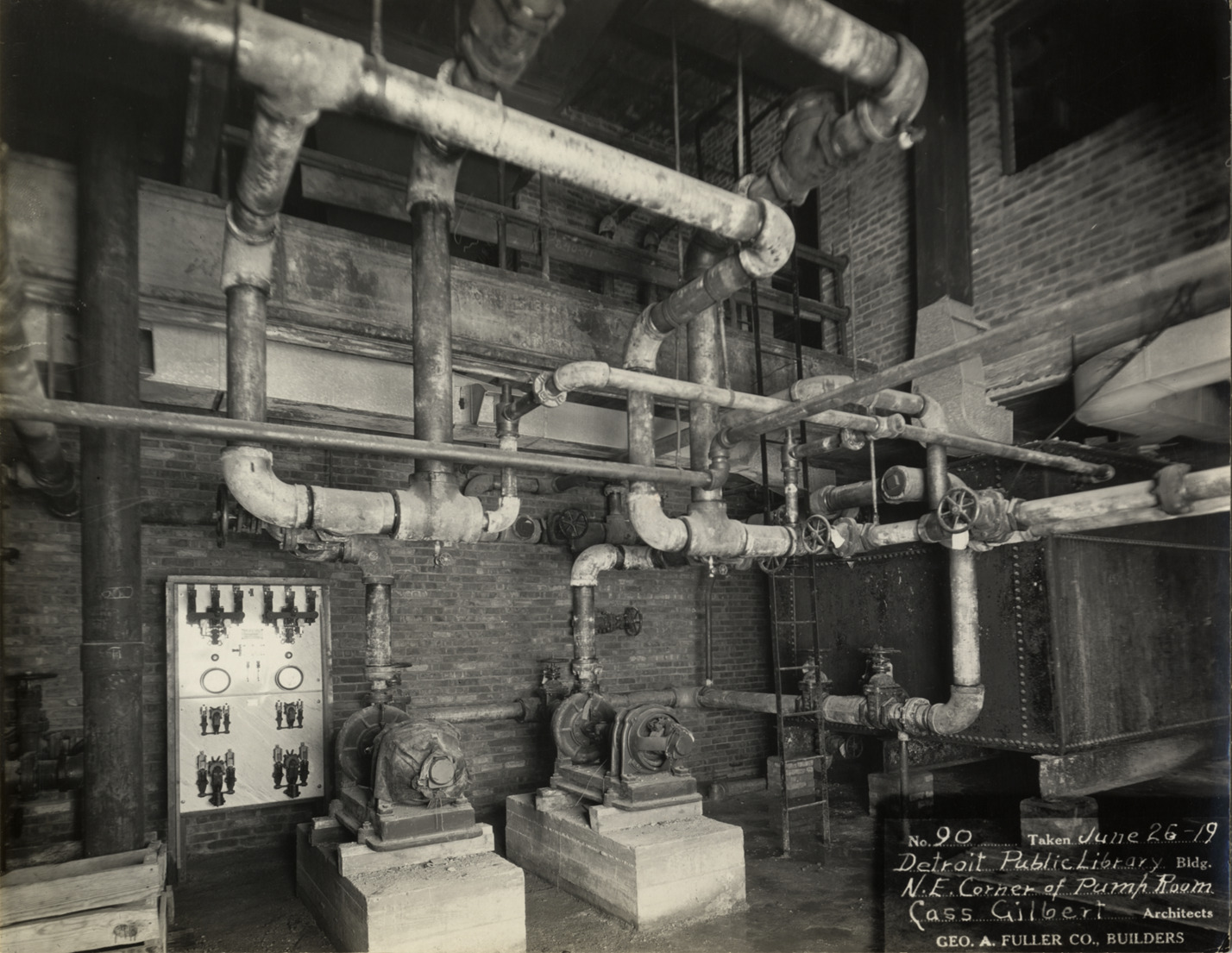 View of pump room, Main Library, Detroit Public Library during construction. Printed on front: "No. 90. Taken June 26-19. Detroit Public Library bldg., n.e. corner of pump room. Cass Gilbert, architects. Geo. A. Fuller Co., builders." Stamped on back: "Manning Bros., commercial photographers, 22-24 Witherell St. Detroit, Michigan."