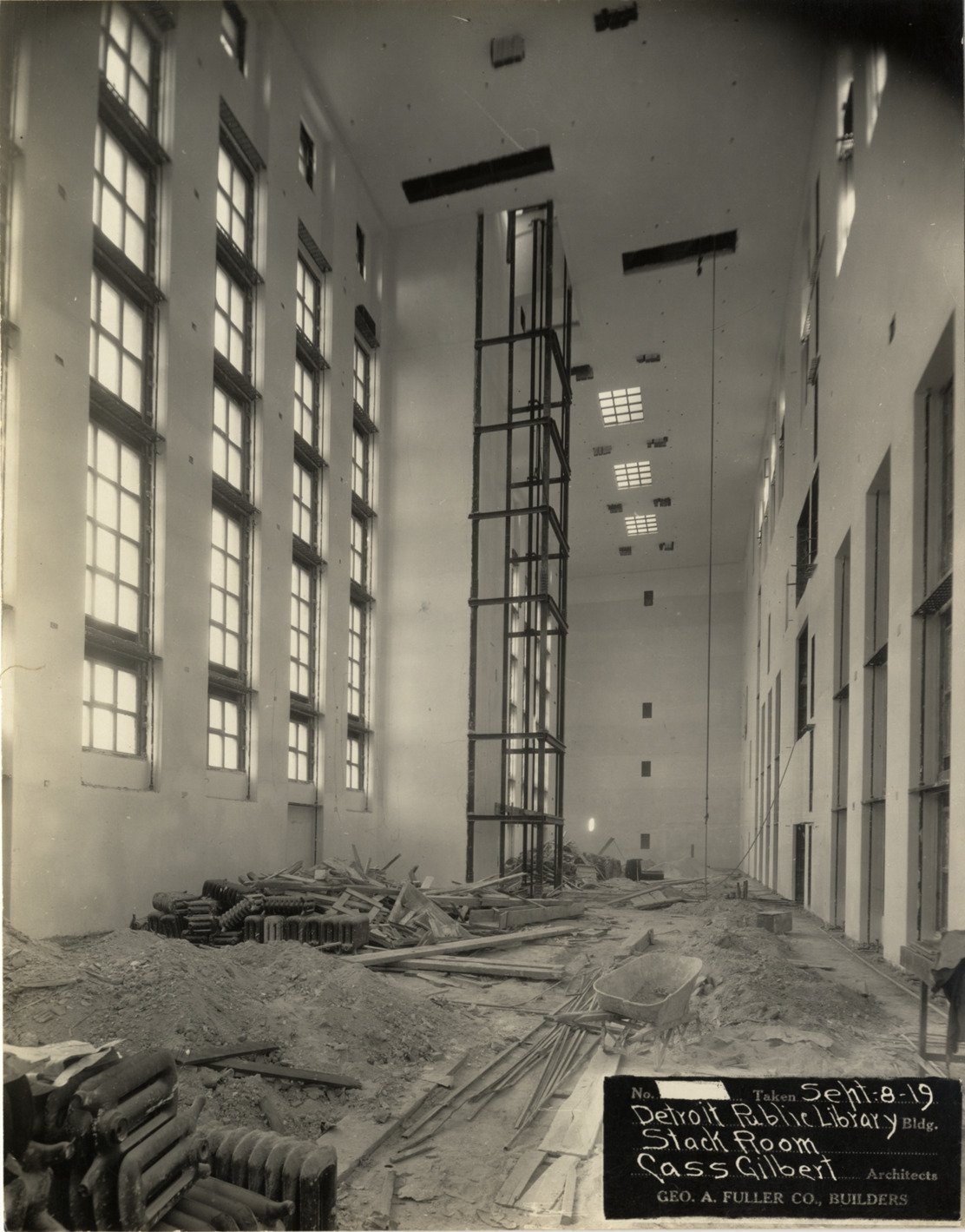 View of stack room, Main Library, Detroit Public Library during construction. Pieces of broken radiators and other construction debris on floor. Printed on front: "No. [blank]. Taken Sept-8-19. Detroit Public Library bldg. Stack room. Cass Gilbert, architects. Geo. A. Fuller Co., builders." Stamped on back: "Manning Bros., commercial photographers, 22-24 Witherell St. Detroit, Michigan."