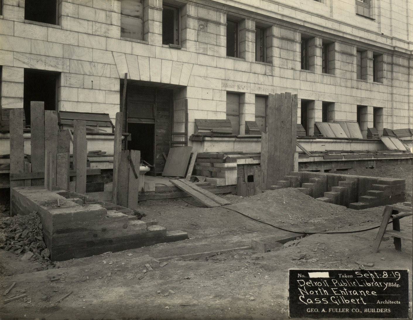 View of north entrance, Main Library, Detroit Public Library during construction. Printed on front: "No. [blank]. Taken Sept-8-19. Detroit Public Library bldg. North entrance. Cass Gilbert, architects. Geo. A. Fuller Co., builders." Stamped on back: "Manning Bros., commercial photographers, 22-24 Witherell St. Detroit, Michigan."