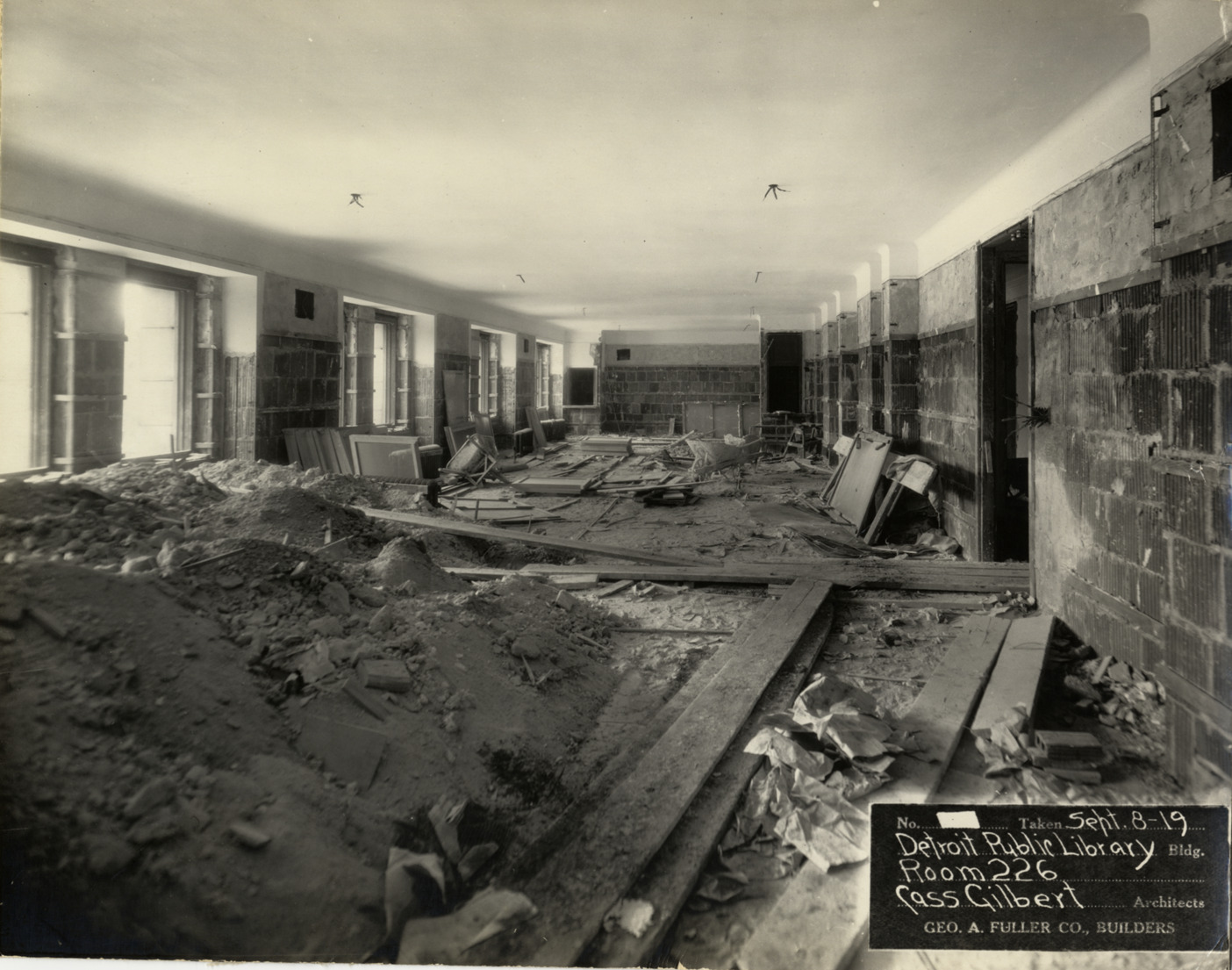 View of room 226, Main Library, Detroit Public Library during construction. Construction debris and equipment in room. Printed on front: "No. [blank]. Taken Sept-8-19. Detroit Public Library bldg. Room 226. Cass Gilbert, architects. Geo. A. Fuller Co., builders." Stamped on back: "Manning Bros., commercial photographers, 22-24 Witherell St. Detroit, Michigan."