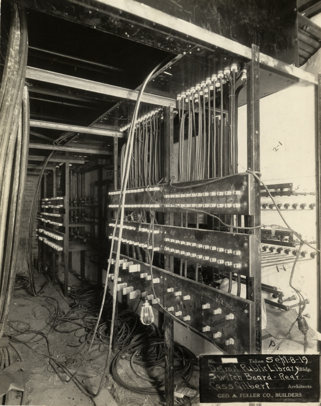 View of switchboard, Main Library, Detroit Public Library during construction. Printed on front: "No. [blank]. Taken Sept-8-19. Detroit Public Library bldg. Switch board, rear. Cass Gilbert, architects. Geo. A. Fuller Co., builders." Stamped on back: "Manning Bros., commercial photographers, 22-24 Witherell St. Detroit, Michigan."