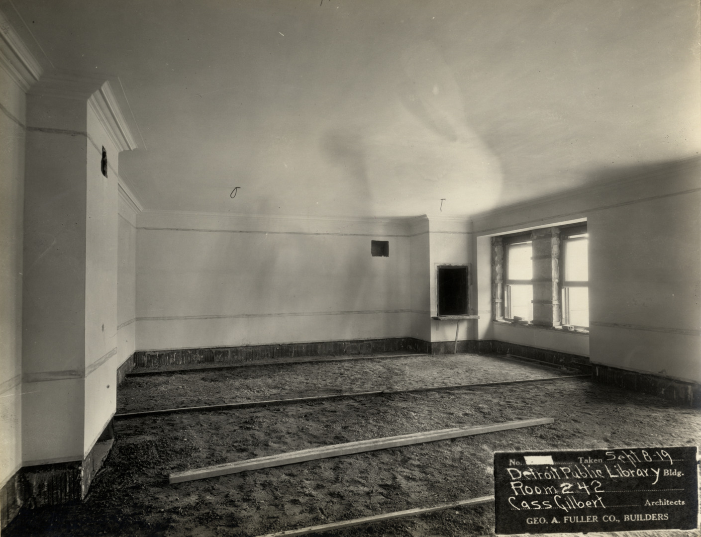 View of room 242, Main Library, Detroit Public Library during construction. Dirt and boards on floor. Printed on front: "No. [blank]. Taken Sept-8-19. Detroit Public Library bldg. Room 242. Cass Gilbert, architects. Geo. A. Fuller Co., builders." Stamped on back: "Manning Bros., commercial photographers, 22-24 Witherell St. Detroit, Michigan."