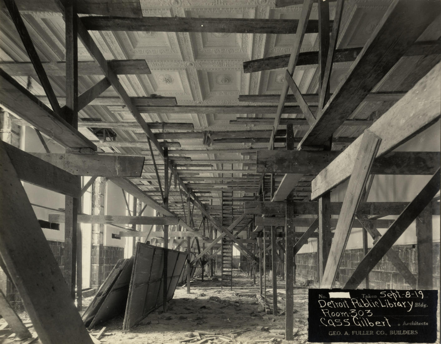 View of room 303, Main Library, Detroit Public Library during construction. Scaffolding, ladders and construction debris in room; view of coffered ceiling overhead. Printed on front: "No. [blank]. Taken Sept-8-19. Detroit Public Library bldg. Room 303. Cass Gilbert, architects. Geo. A. Fuller Co., builders." Stamped on back: "Manning Bros., commercial photographers, 22-24 Witherell St. Detroit, Michigan."