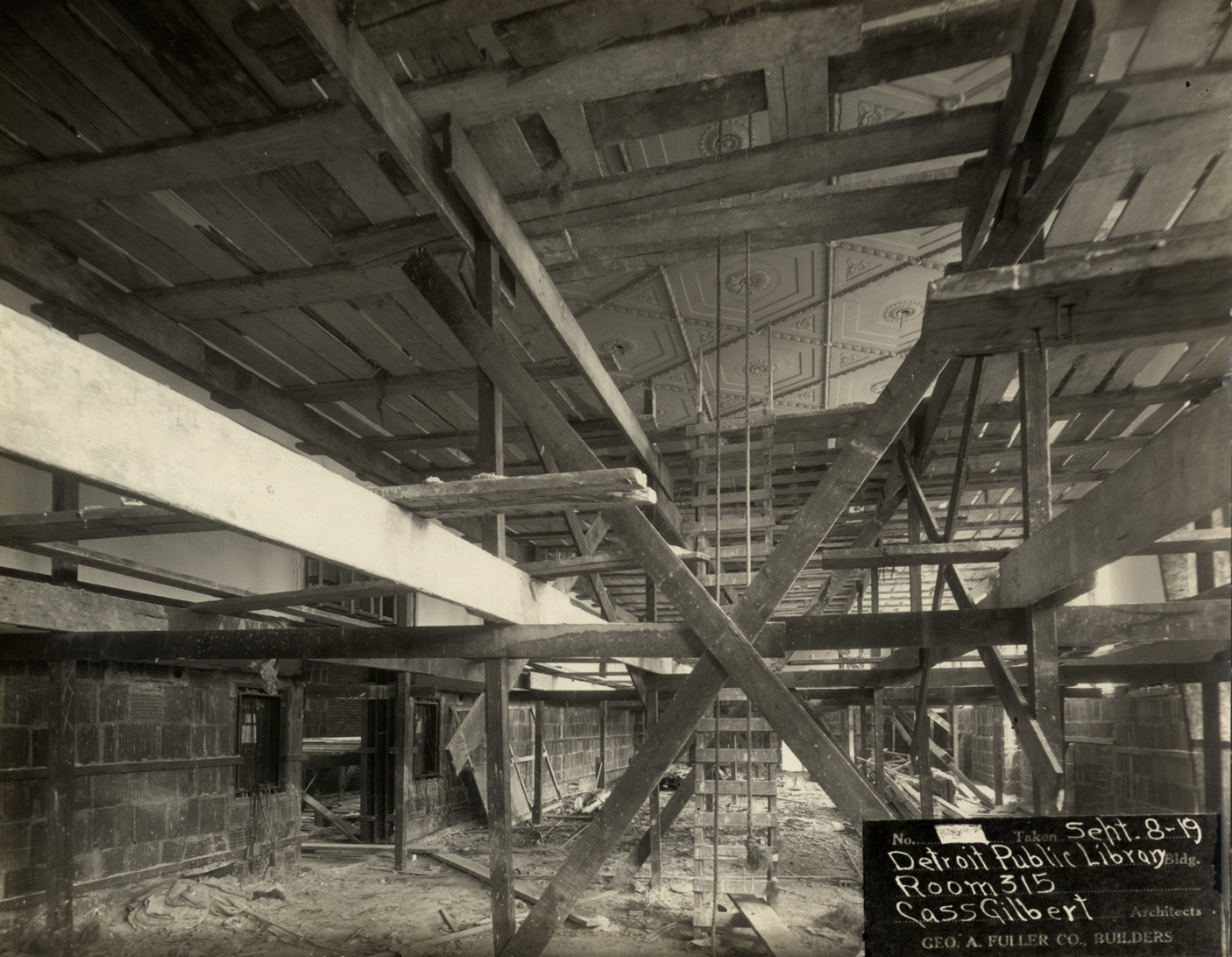 View of room 315, Main Library, Detroit Public Library during construction. Scaffolding, ladders and construction debris in room. Decorative ceiling visible through scaffolding. Printed on front: "No. [blank]. Taken Sept-8-19. Detroit Public Library bldg. Room 315. Cass Gilbert, architects. Geo. A. Fuller Co., builders." Stamped on back: "Manning Bros., commercial photographers, 22-24 Witherell St. Detroit, Michigan."