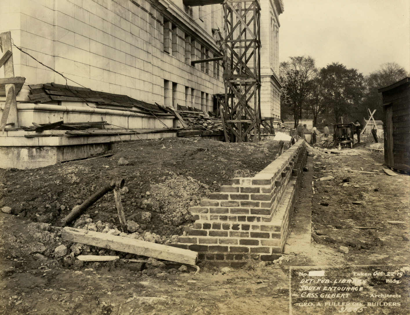 View of south entourage or terrace, Main Library, Detroit Public Library during construction. Scaffolding adjacent to building; construction workers and wagon in background. Printed on front: "No. [blank]. Taken Oct-22-19. Det-Pub-Library bldg. South entourage. Cass Gilbert, architects. Geo. A. Fuller Co., builders. 31655." Stamped on back: "Manning Bros., commercial photographers, 22-24 Witherell St. Detroit, Michigan." Typed on back: "Cass Gilbert, architect."