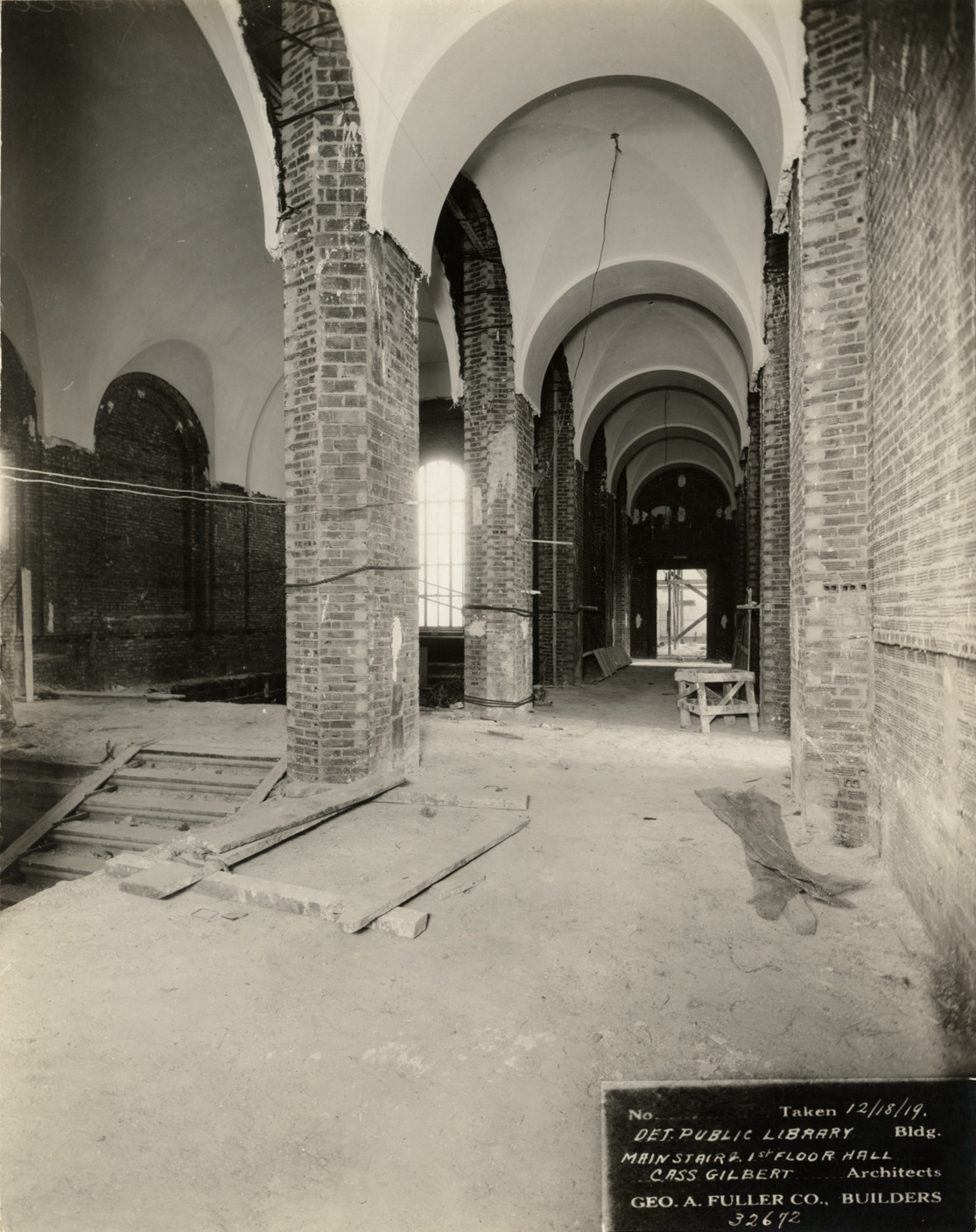 View of main staircase and first floor hallway, Main Library, Detroit Public Library during construction. Hall has vaulted ceiling. Printed on front: "No. [blank]. Taken 12/18/19. Det. Public Library bldg. Main stair & 1st floor hall. Cass Gilbert, architects. Geo. A. Fuller Co., builders. 32672." Stamped on back: "Manning Bros., commercial photographers, 504-505 Lincoln building. Corner State and Park Sts. Detroit, Mich."