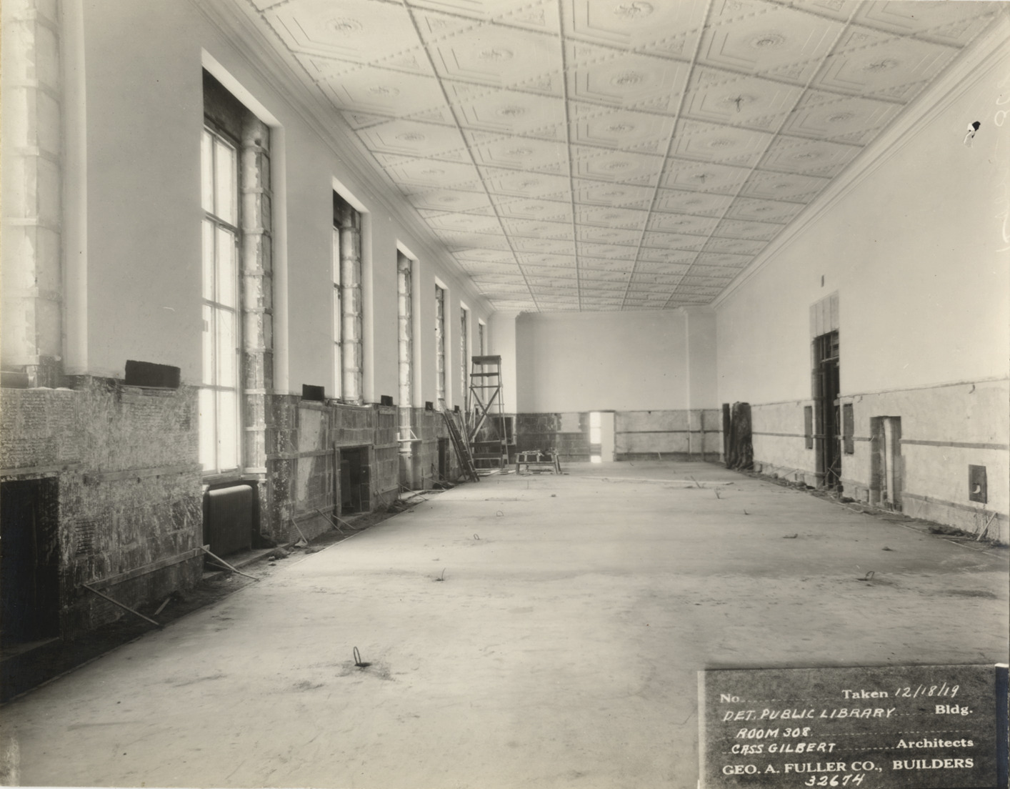 View of room 308 with decorative ceiling, Main Library, Detroit Public Library during construction. Printed on front: "No. [blank]. Taken 12/18/19. Det. Public Library bldg. Room 308. Cass Gilbert, architects. Geo. A. Fuller Co., builders. 32674." Stamped on back: "Manning Bros., commercial photographers, 504-505 Lincoln building. Corner State and Park Sts. Detroit, Mich."