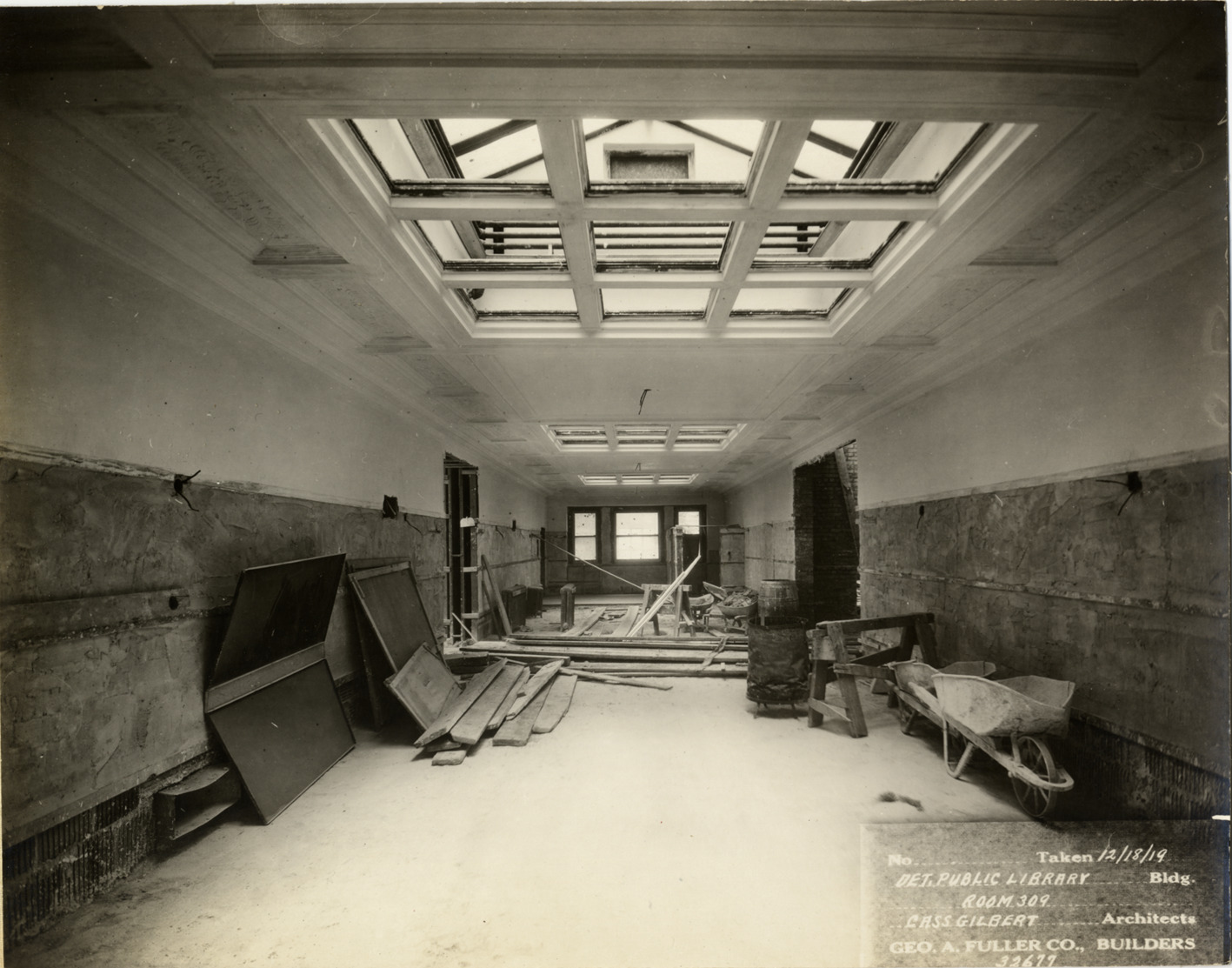 View of room 309, Main Library, Detroit Public Library during construction. Skylights visible in ceiling; wheelbarrow and construction debris in room. Printed on front: "No. [blank]. Taken 12/18/19. Det. Public Library bldg. Room 309. Cass Gilbert, architects. Geo. A. Fuller Co., builders. 32677." Stamped on back: "Manning Bros., commercial photographers, 504-505 Lincoln building. Corner State and Park Sts. Detroit, Mich."