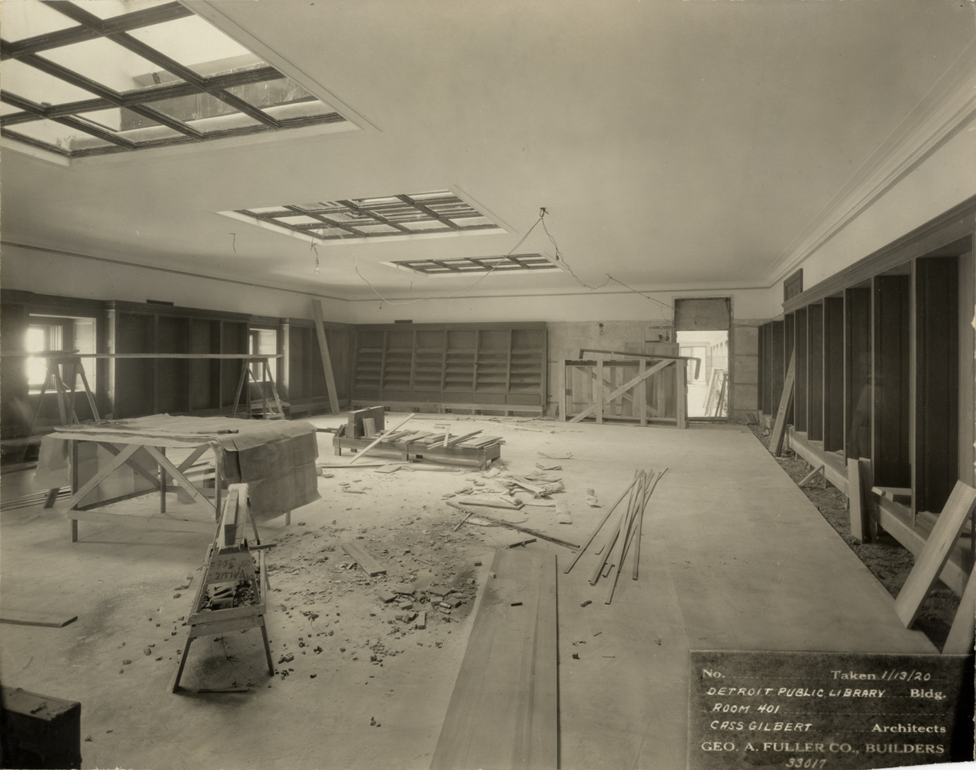 View of room 401, Main Library, Detroit Public Library during construction. Bookshelves under construction line walls; sawhorses and other carpentry materials in center of room. Skylights in ceiling. Printed on front: "No. [blank]. Taken 1/13/20. Detroit Public Library bldg., room 401. Cass Gilbert, architects. Geo. A. Fuller Co., builders, 33017." Stamped on back: "Manning Bros., commercial photographers, 504-505 Lincoln Building, corner State and Park Sts., Detroit, Mich."